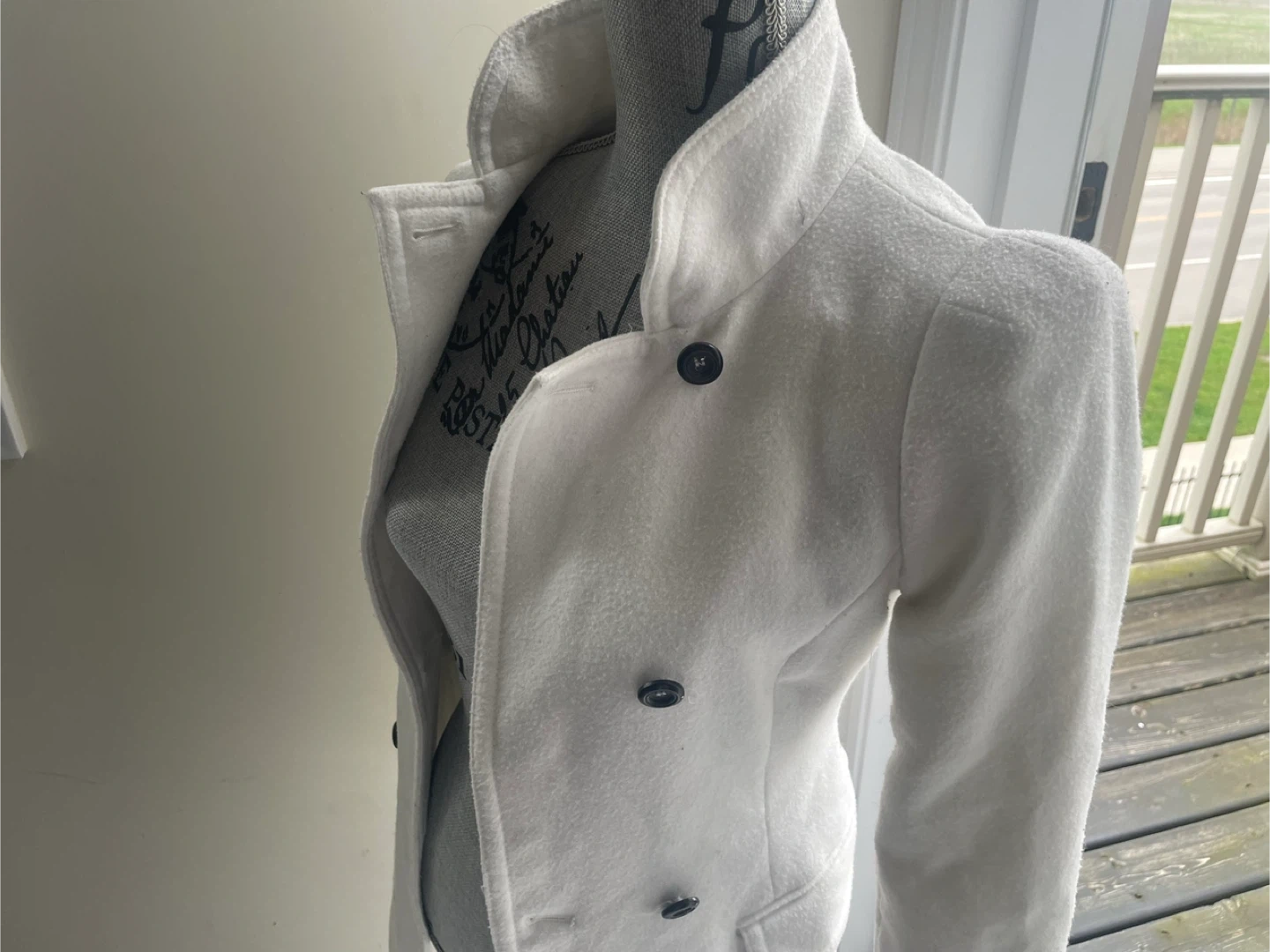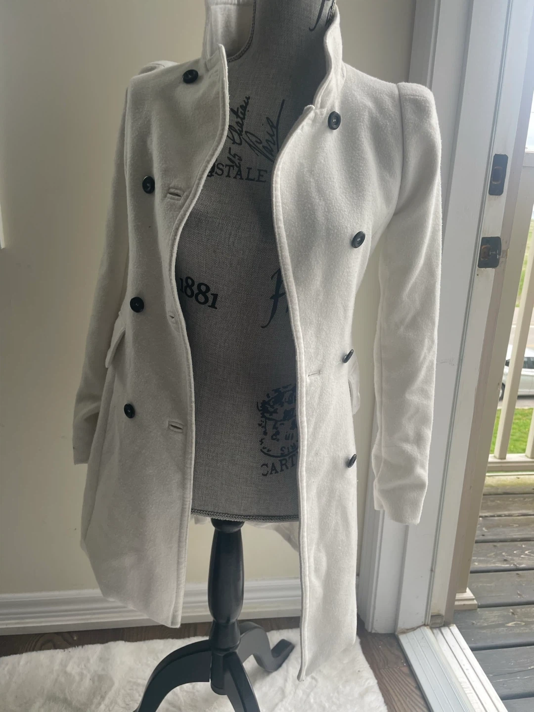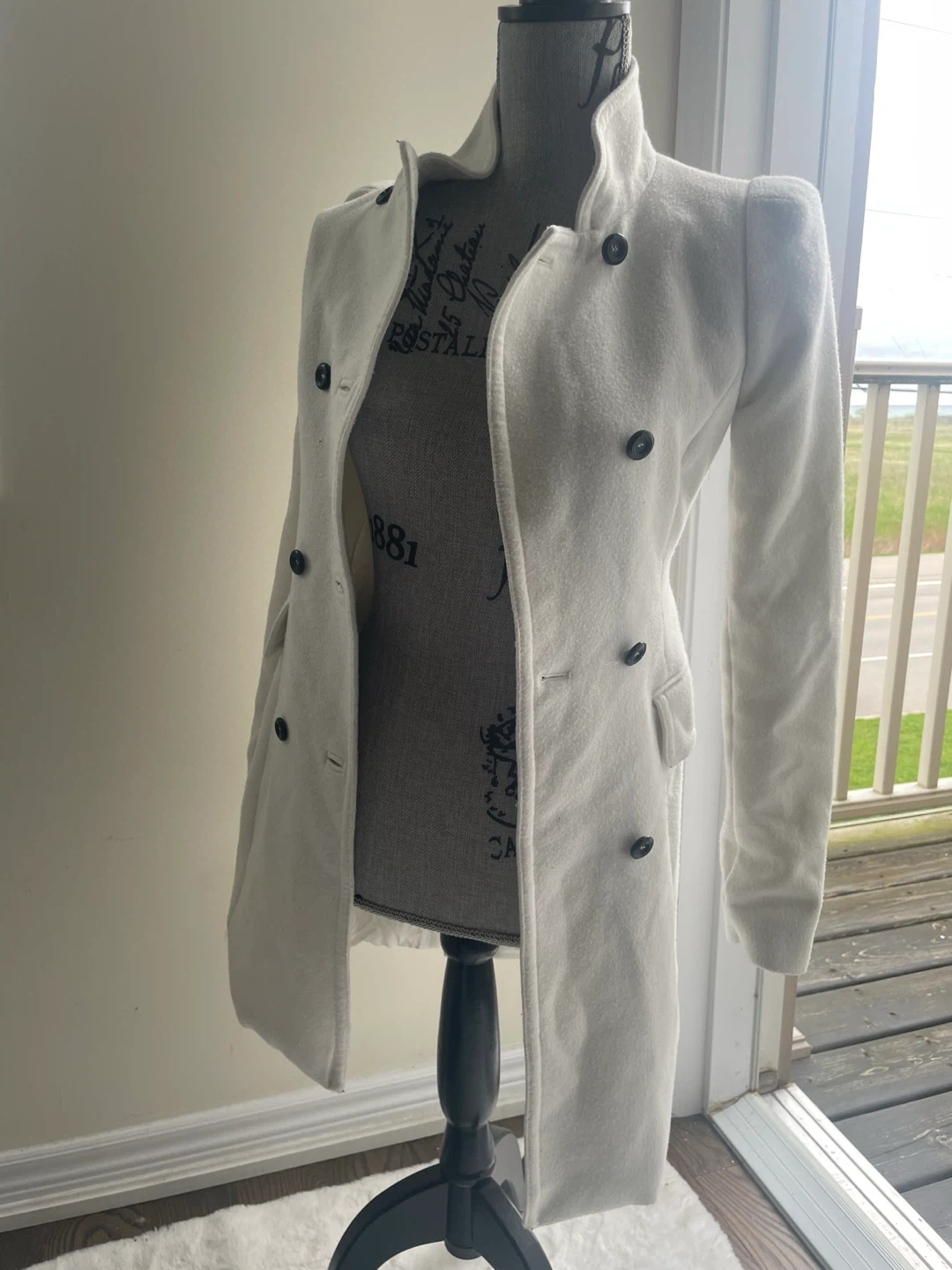 Zara Woman white coat in size XS. Double-breasted style with black buttons. Made in Morocco. It's a stylish outerwear piece for cooler days!