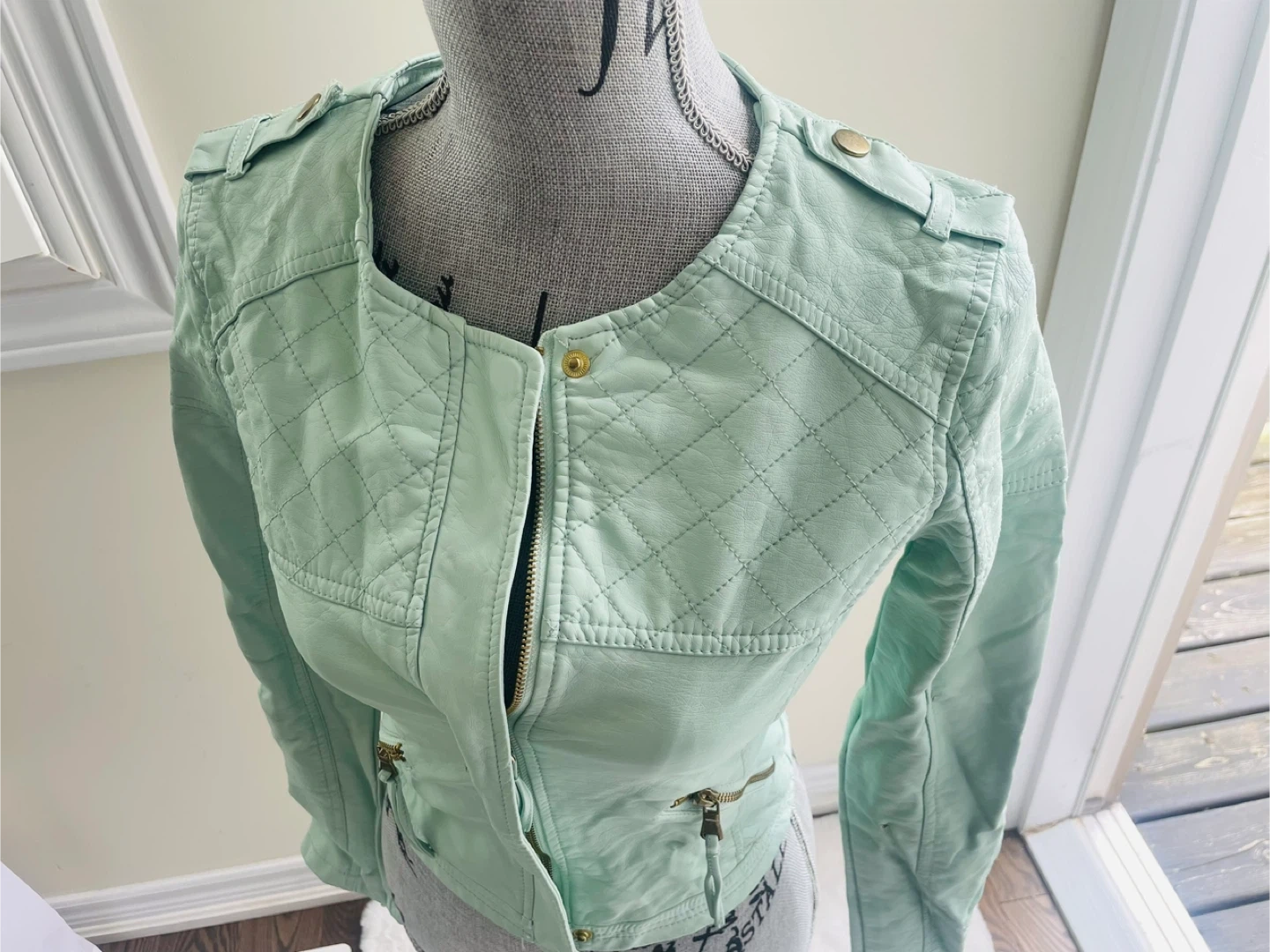 This mint green moto jacket features a stylish quilted pattern on the shoulders and chest. It has a full zip front and zippered pockets. A great layering piece for any outfit!