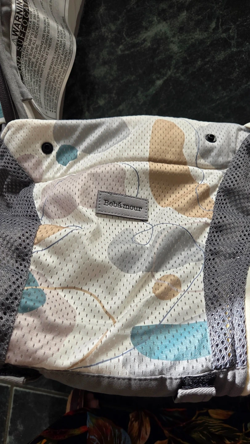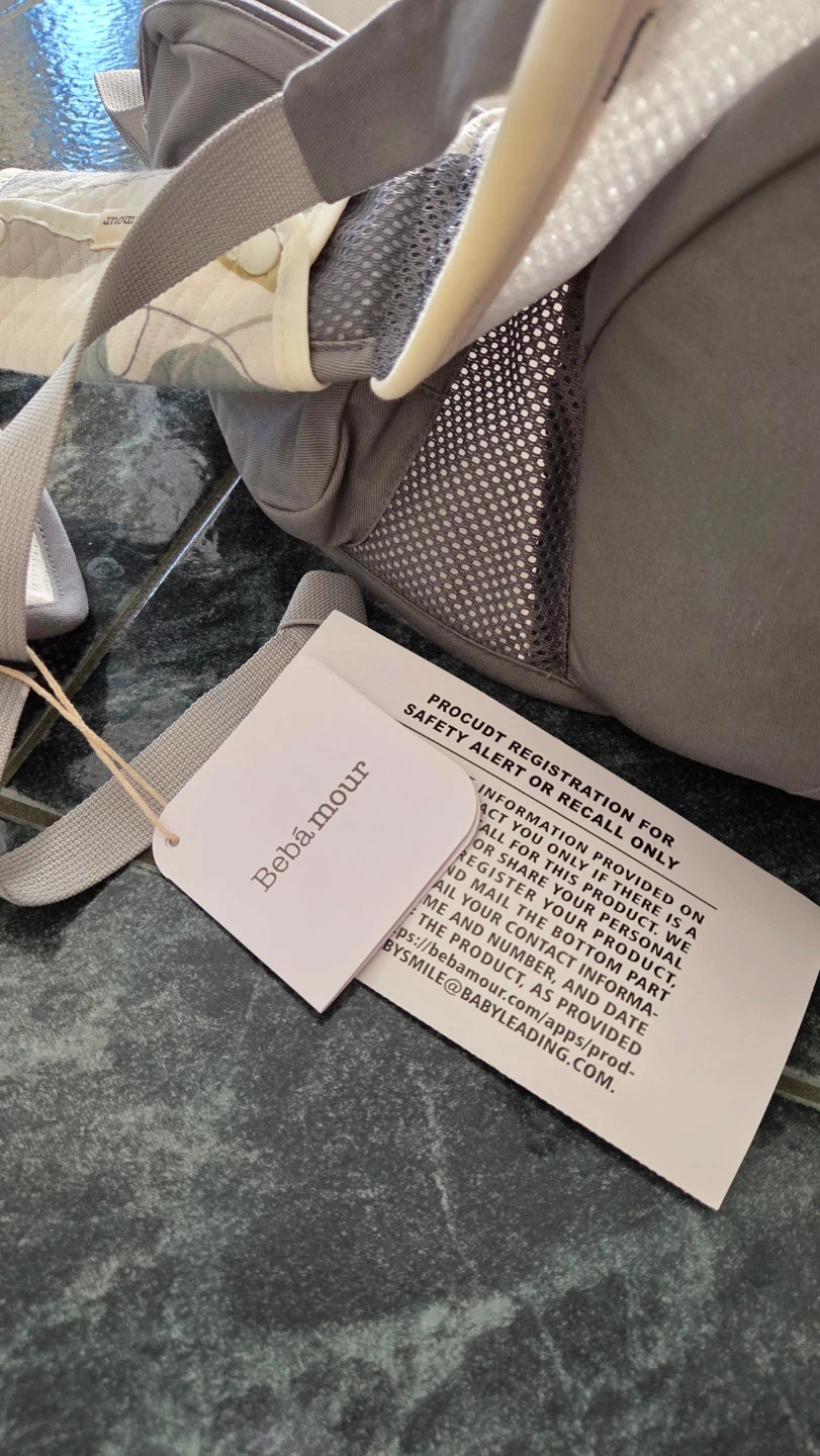 This is a brand new Bébamour baby carrier, designed for comfort and convenience. It's made from a soft, grey fabric with mesh accents for breathability.