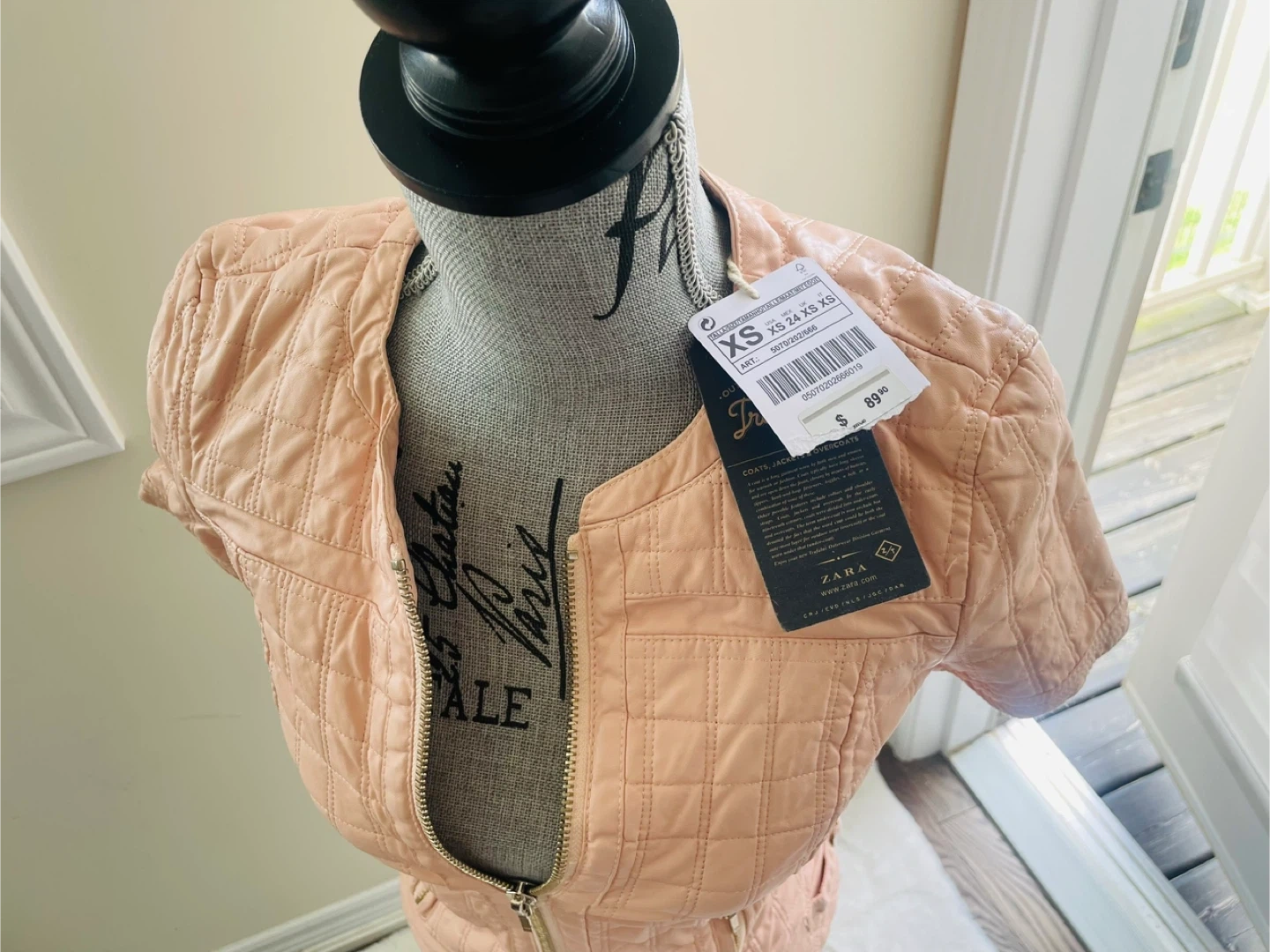 This is a ZARA quilted short sleeve jacket in a size XS. It features a full zip front and two zip pockets. The material is a soft peach colour.