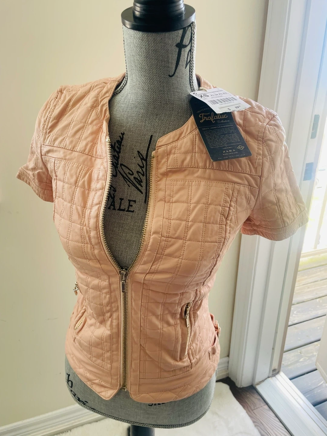 This is a ZARA quilted short sleeve jacket in a size XS. It features a full zip front and two zip pockets. The material is a soft peach colour.