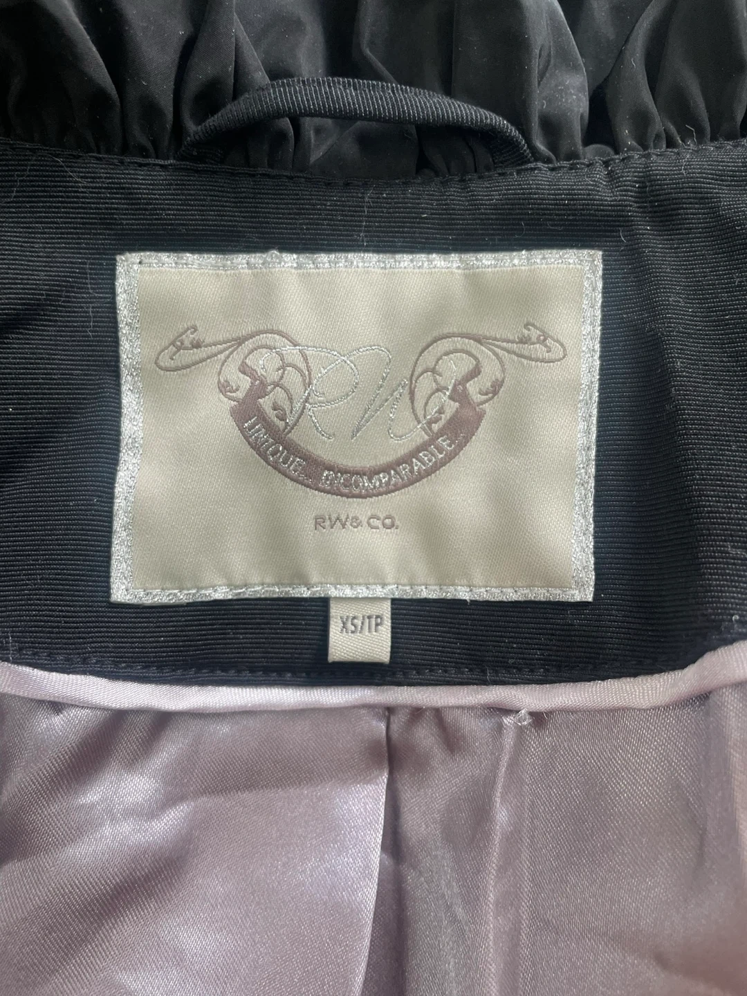 This black RW&Co. coat features a dramatic ruffled hood and a cinched waist with a belt. It's made with a durable fabric and a silky lining. It's perfect for cooler weather and adding a stylish touch to your outfit!