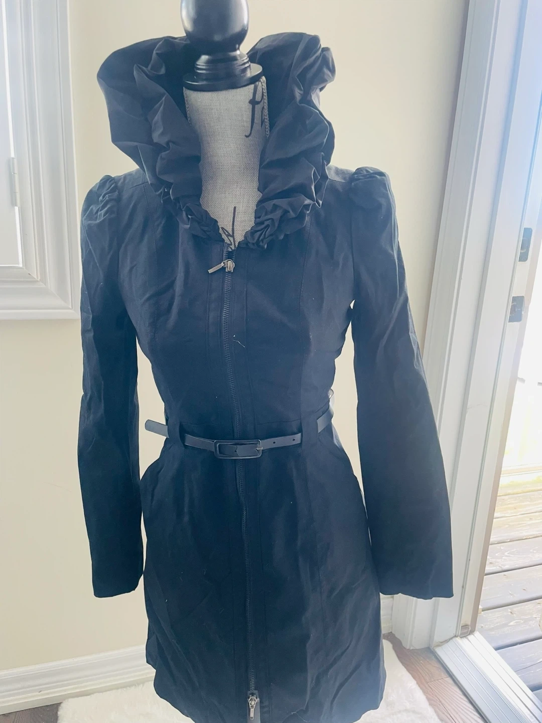 This black RW&Co. coat features a dramatic ruffled hood and a cinched waist with a belt. It's made with a durable fabric and a silky lining. It's perfect for cooler weather and adding a stylish touch to your outfit!