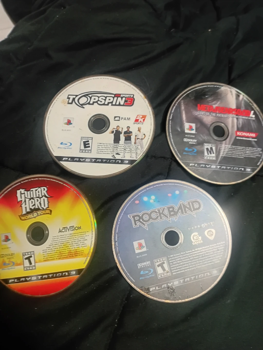 Includes Topspin 3, Metal Gear Solid 4: Guns of the Patriots, Guitar Hero: World Tour, and Rockband for Playstation 3. These are Blu-ray discs. Suitable for teens and up.