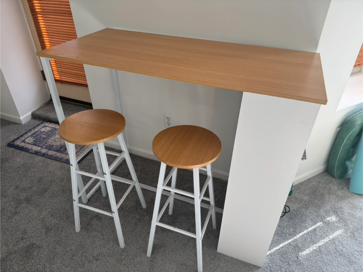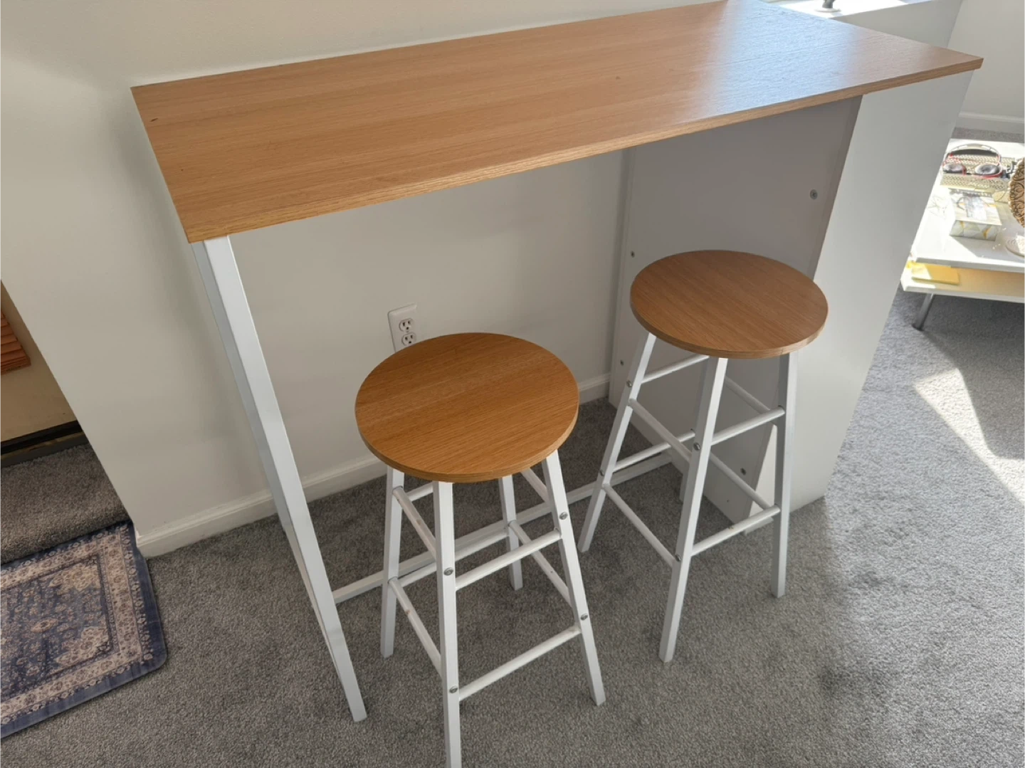 This bar table set includes a tabletop and two stools, perfect for small spaces. The table has a wood-grain top and white legs, with integrated shelving. The stools are white with round wood-grain seats. Table dimensions: 47.2in W x 21.7in D x 39.4in H. Stool dimensions: 12.2in W x 11.8in D x 27.8in H. Shelf dimensions: 11.8in W x 11.8in D x 11.8in H. MSRP is $120.