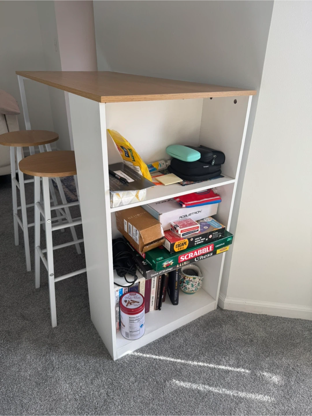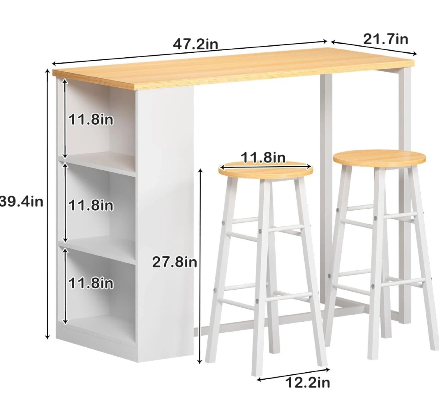 This bar table set includes a tabletop and two stools, perfect for small spaces. The table has a wood-grain top and white legs, with integrated shelving. The stools are white with round wood-grain seats. Table dimensions: 47.2in W x 21.7in D x 39.4in H. Stool dimensions: 12.2in W x 11.8in D x 27.8in H. Shelf dimensions: 11.8in W x 11.8in D x 11.8in H. MSRP is $120.