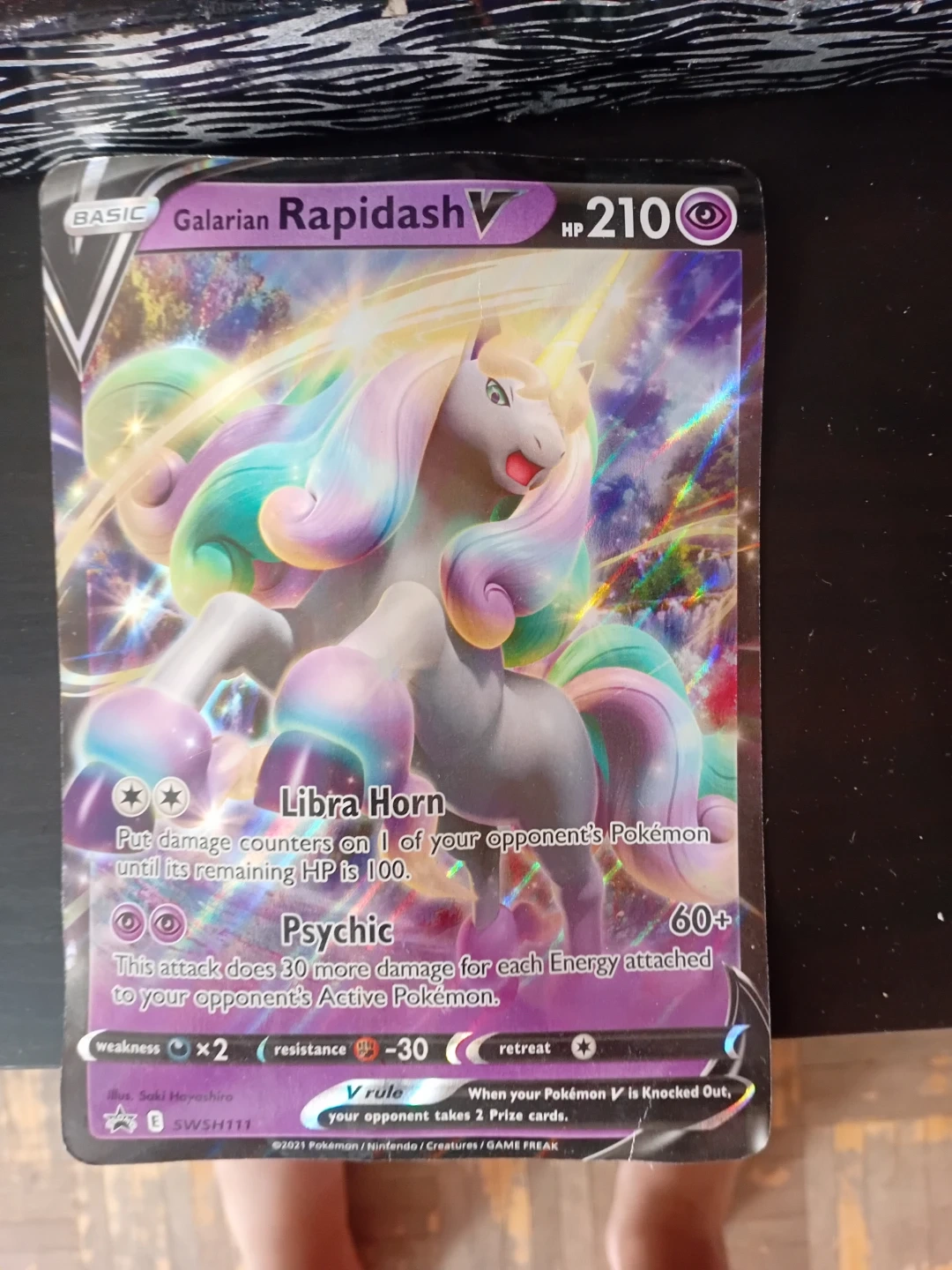 This is a Pokemon Trading Card featuring Galarian Rapidash V. The card number is SWSH111. It has 210 HP and features the Libra Horn and Psychic attacks. It's from 2021.