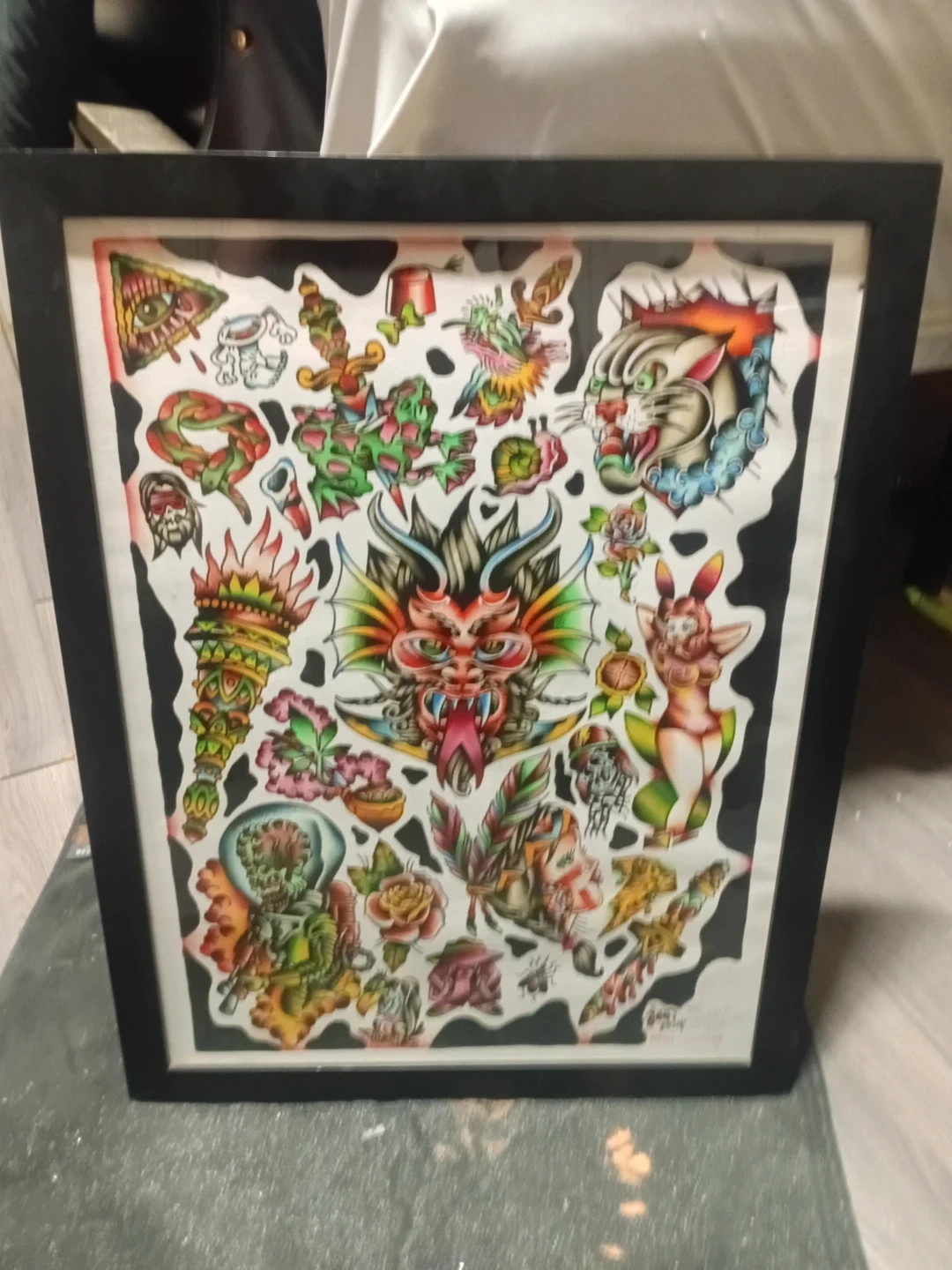 Make me a offer This framed print showcases a vibrant collection of traditional tattoo flash designs. It features iconic imagery such as dragons, panthers, roses, and various symbolic elements. The artwork is presented in a simple black frame.