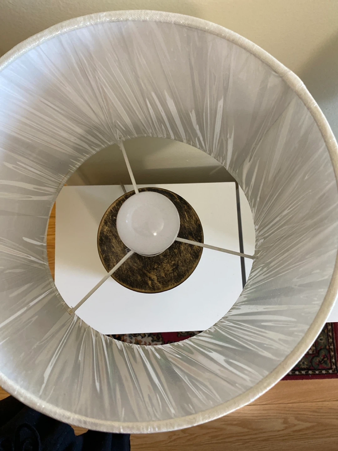 This pair of table lamps features a unique iridescent chevron pattern in green and blue. Used in staging a house. The plastic is still over the white shades.The textured cylindrical bases have a decorative gold-toned trim. Each lamp comes with a white fabric lampshade. Perfect for adding a stylish touch to any room!