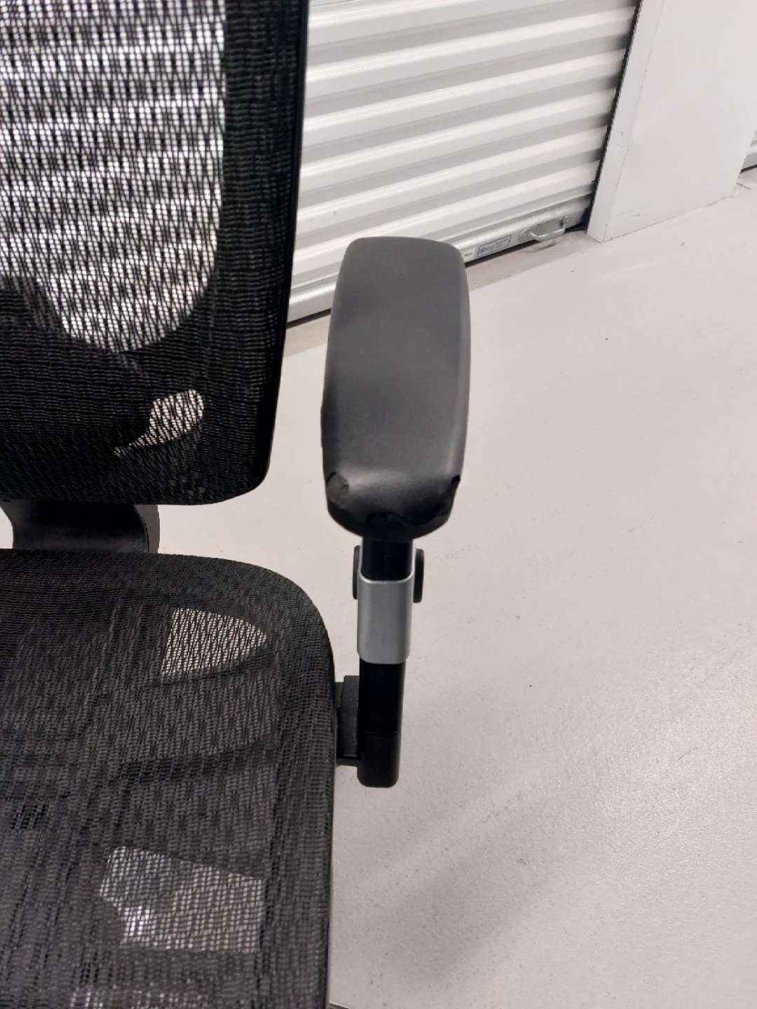 This black mesh office chair offers good back support. It has adjustable armrests and a headrest for added comfort. The mesh material allows for breathability during long work sessions.it has some wear and tare but not much still works great