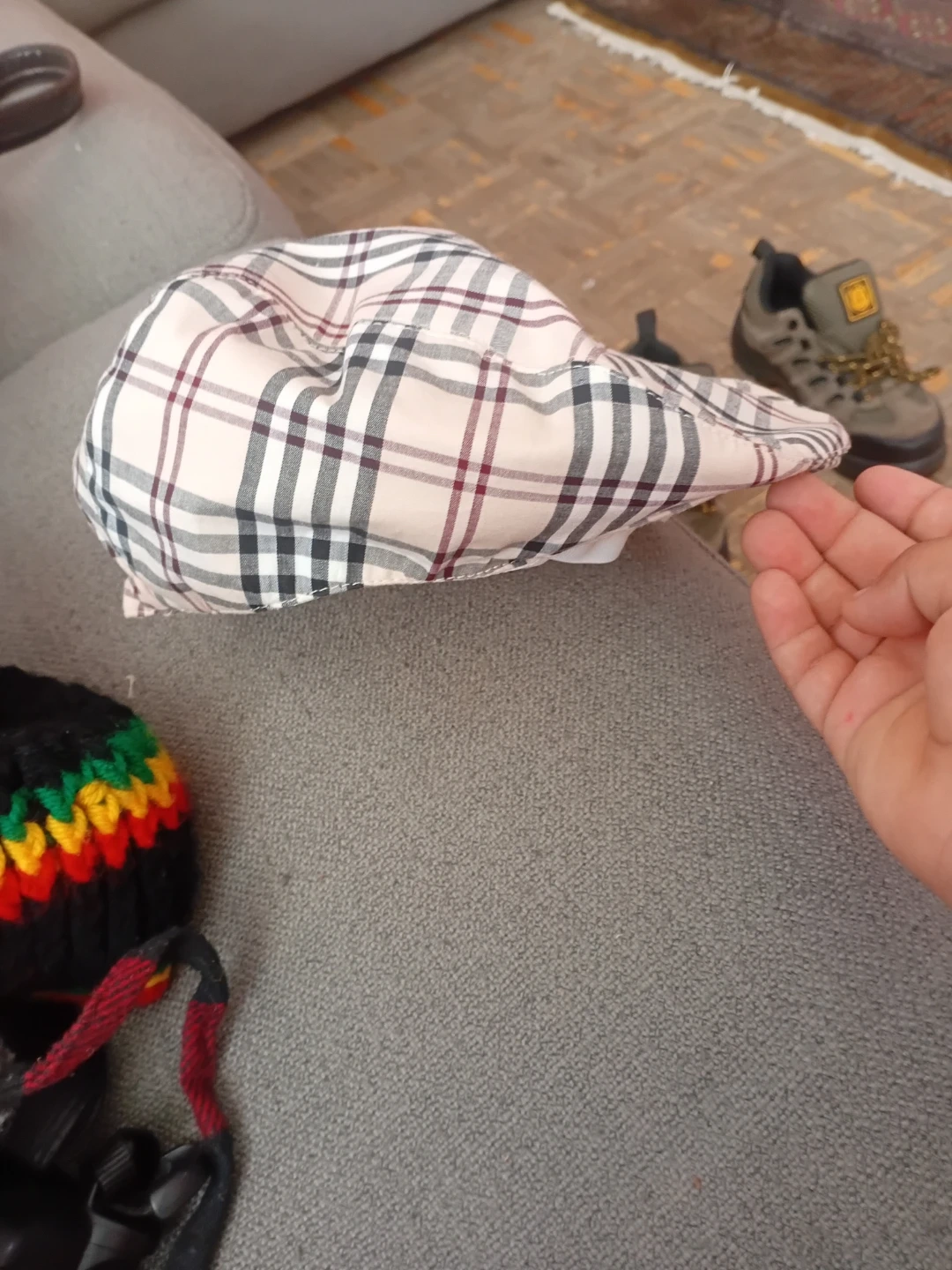 This is a Nova Check flat cap. It's made of a cotton blend. It's a great accessory for any outfit! It is a custom made hat that I got for my sons communion. And he barley wore it