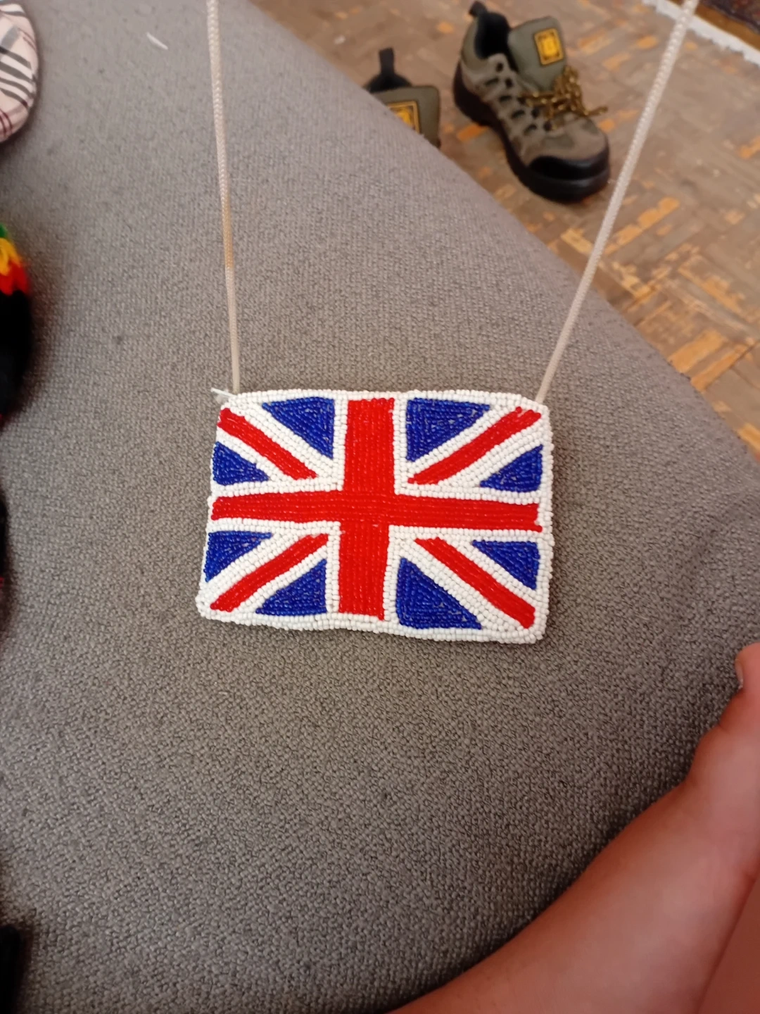 A cute coin purse adorned with a beaded Union Jack design. It features a white cord strap for easy carrying. Beaded construction .I got this strate from England when I went in 2003