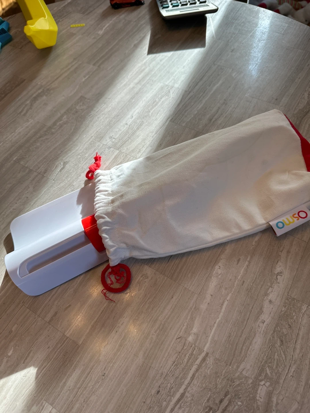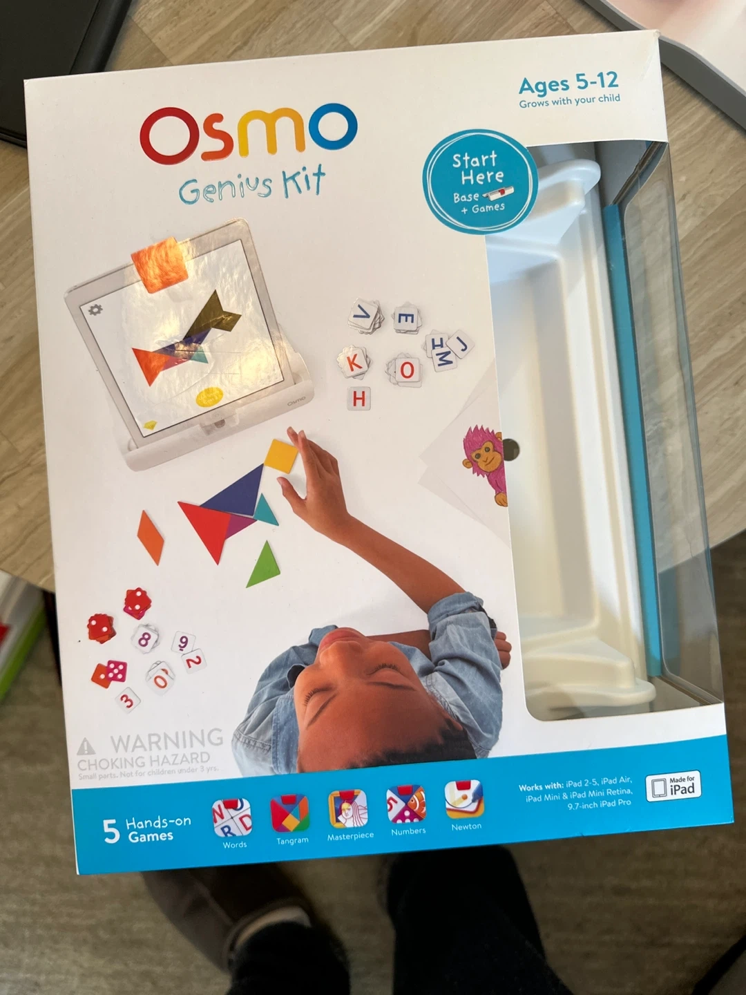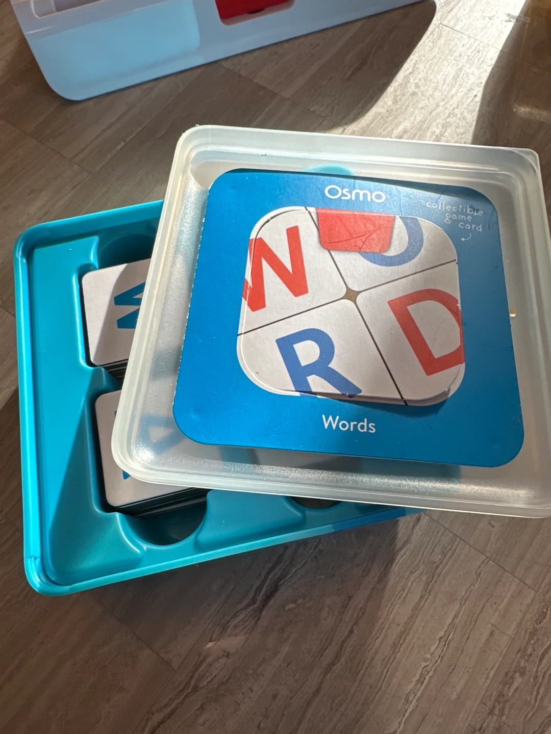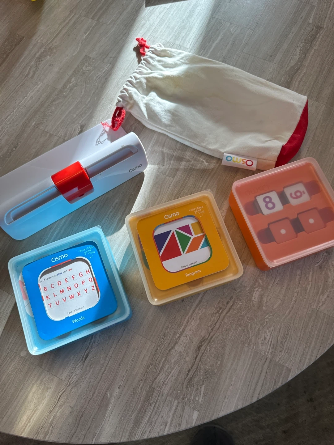 Osmo educational gaming system includes Tangram, Words, and Numbers games. It comes with the Osmo base, a storage pouch, and individual game cases. Great for learning and play!