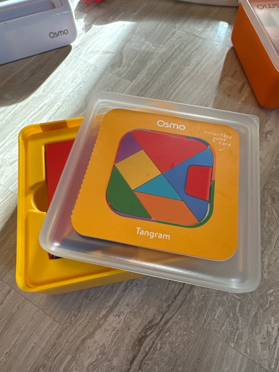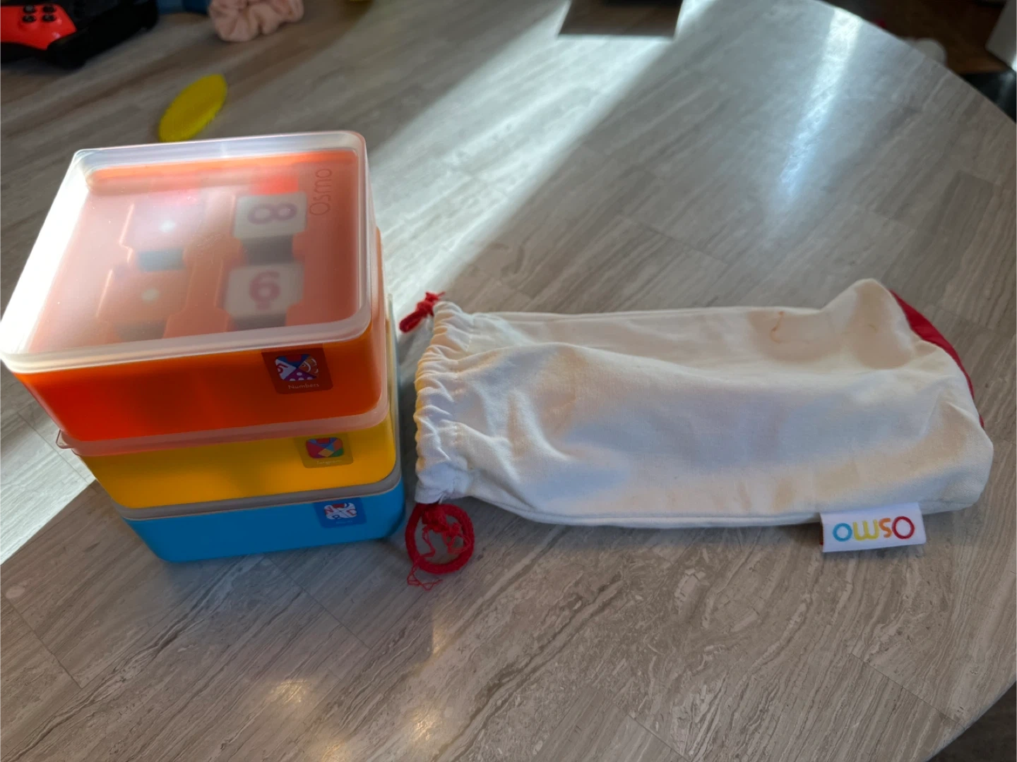 Osmo educational gaming system includes Tangram, Words, and Numbers games. It comes with the Osmo base, a storage pouch, and individual game cases. Great for learning and play!