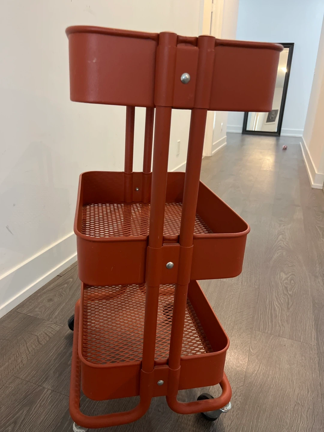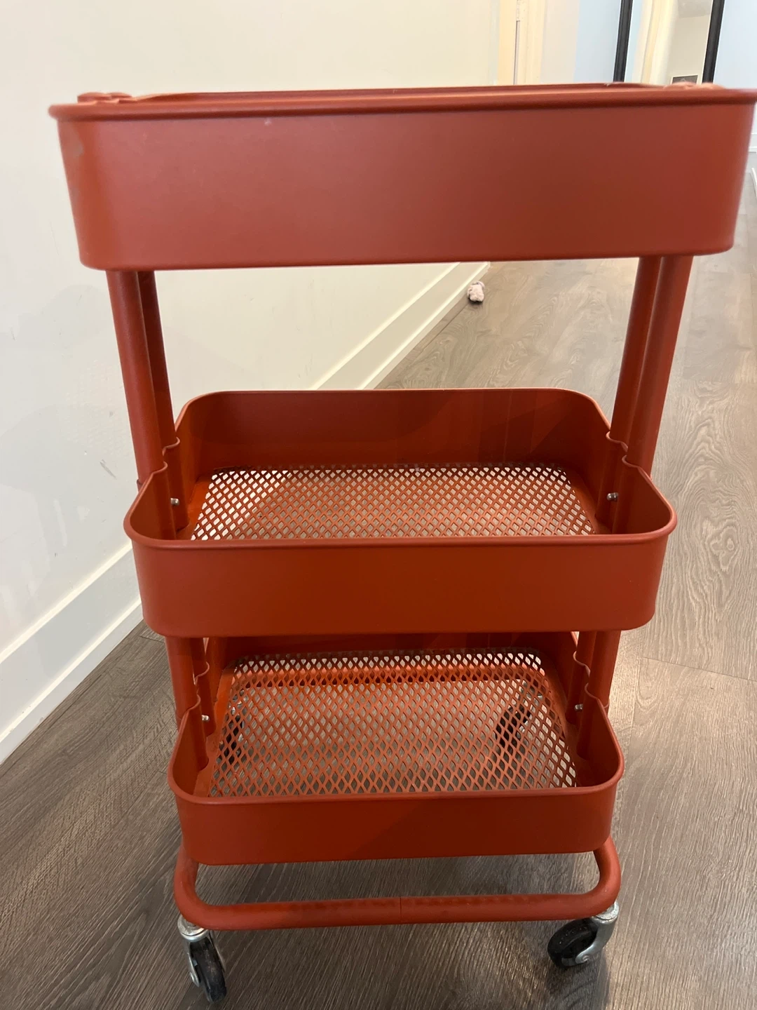This rolling cart has three perforated tiers and a bright orange finish. It's great for organizing items in a kitchen, bathroom, or craft room. The wheels make it easy to move around your space!