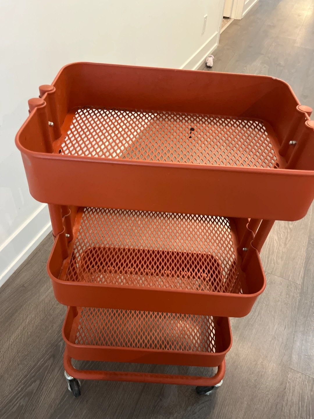 This rolling cart has three perforated tiers and a bright orange finish. It's great for organizing items in a kitchen, bathroom, or craft room. The wheels make it easy to move around your space!