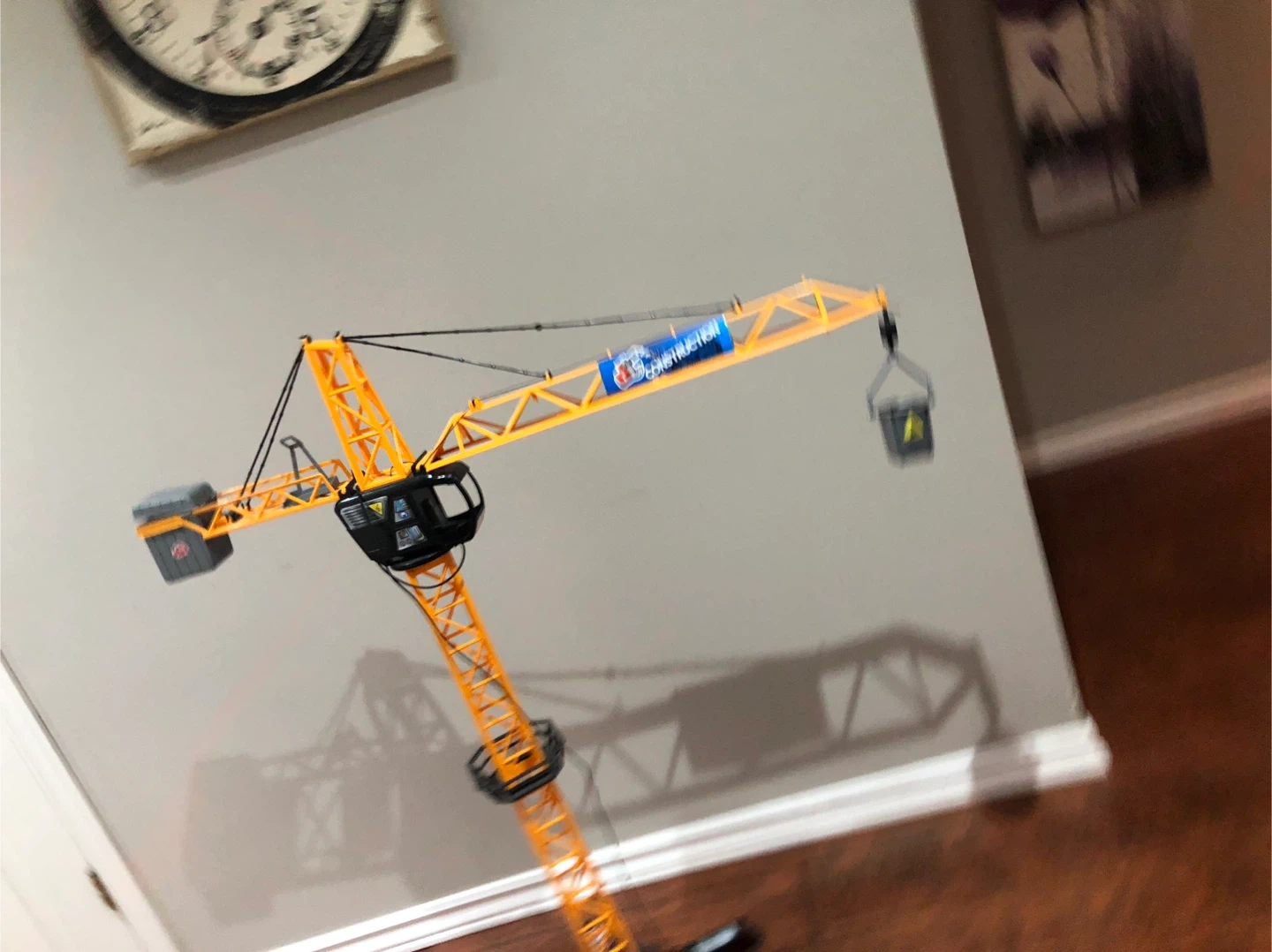 This is a remote-controlled construction crane toy. It's yellow and black with a functional bucket and hook. Comes with a remote control for operation. Great for imaginative play!