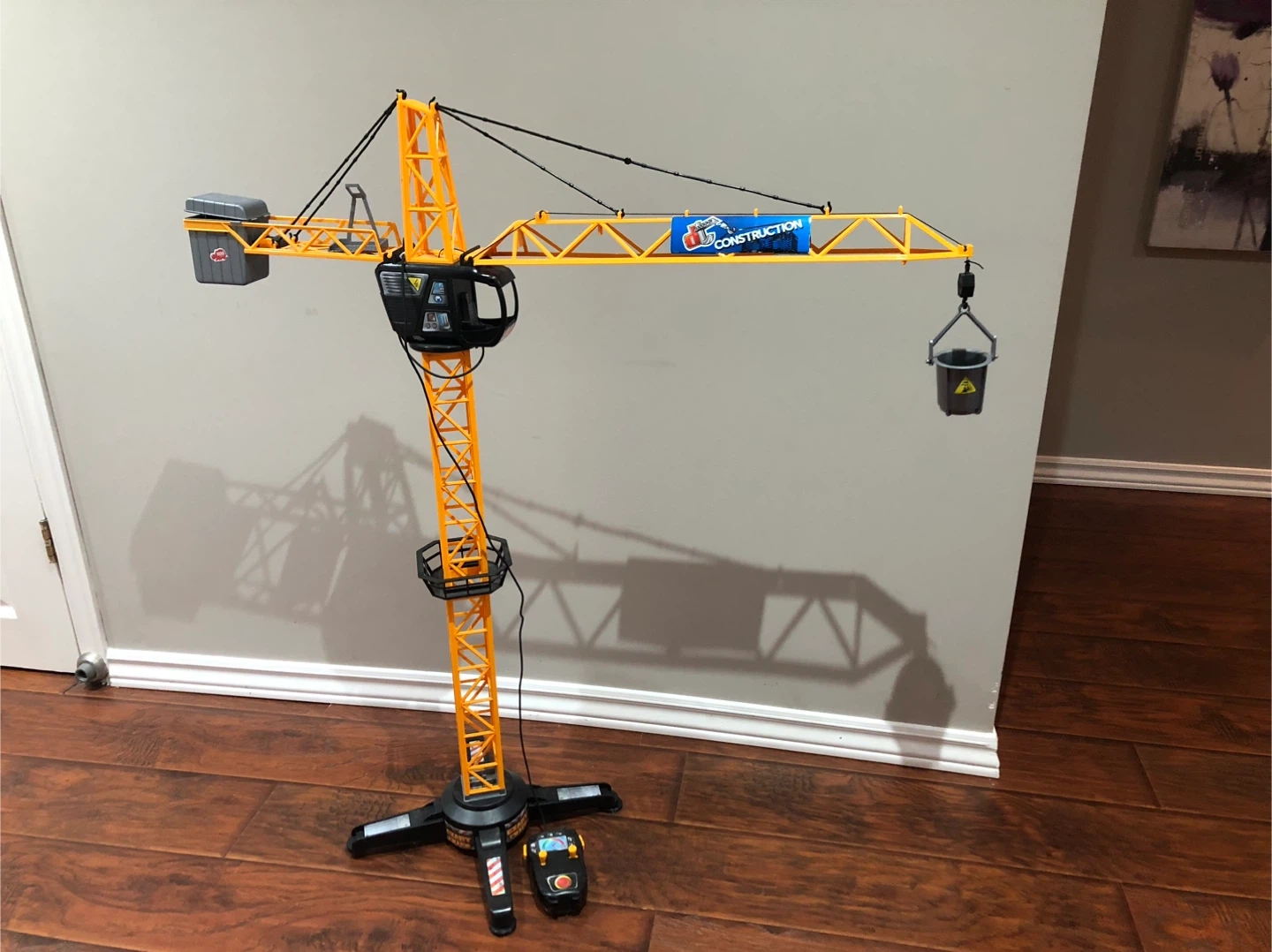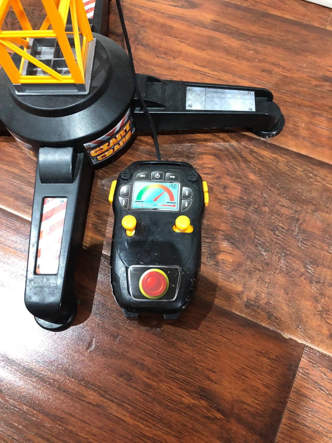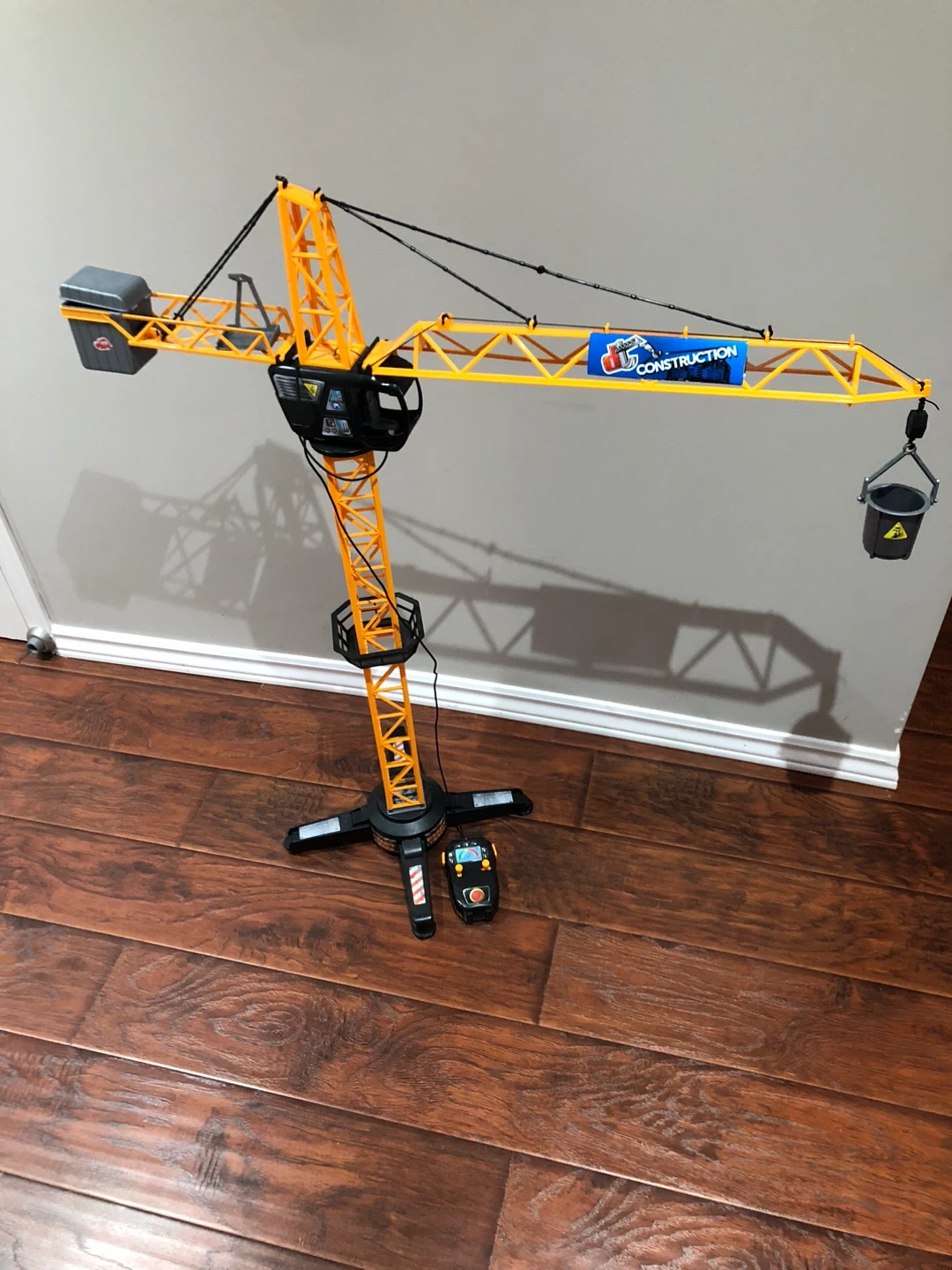 This is a remote-controlled construction crane toy. It's yellow and black with a functional bucket and hook. Comes with a remote control for operation. Great for imaginative play!