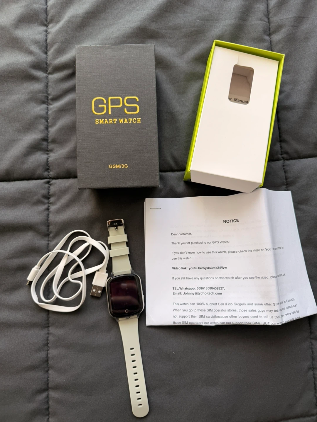 This is a GPS smart watch with GSM/3G capabilities. It includes features like making friends, taking pictures, and a pedometer. The watch comes with its charging cable and original box.
