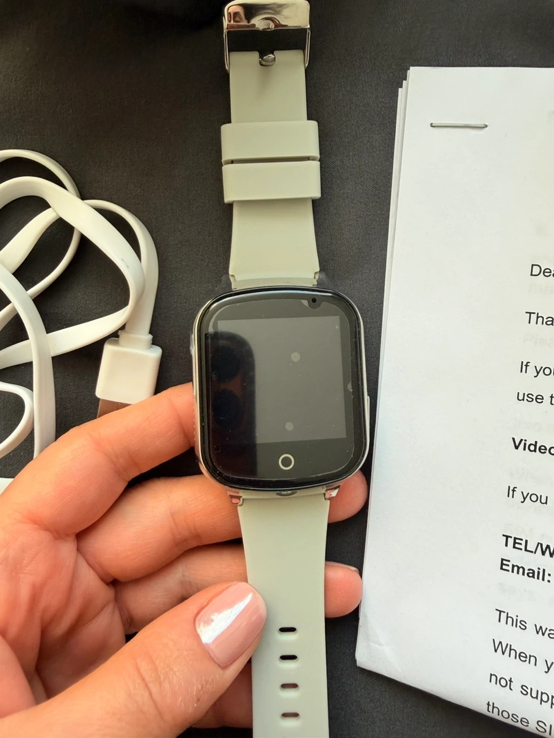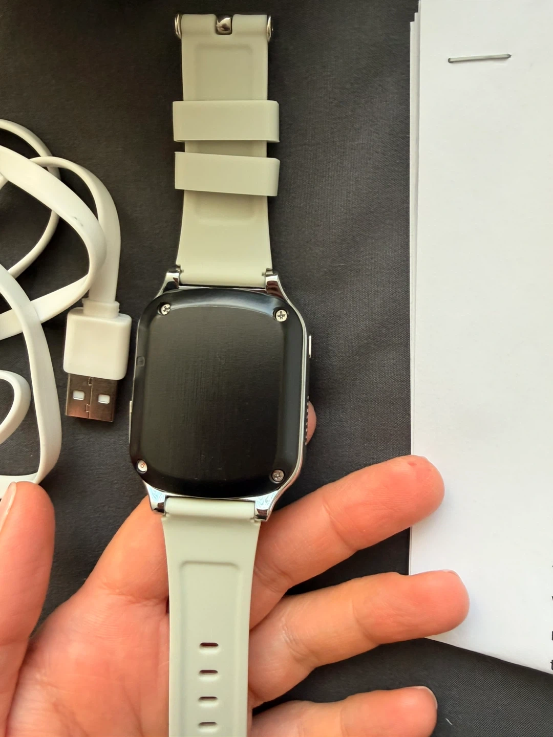 This is a GPS smart watch with GSM/3G capabilities. It includes features like making friends, taking pictures, and a pedometer. The watch comes with its charging cable and original box.