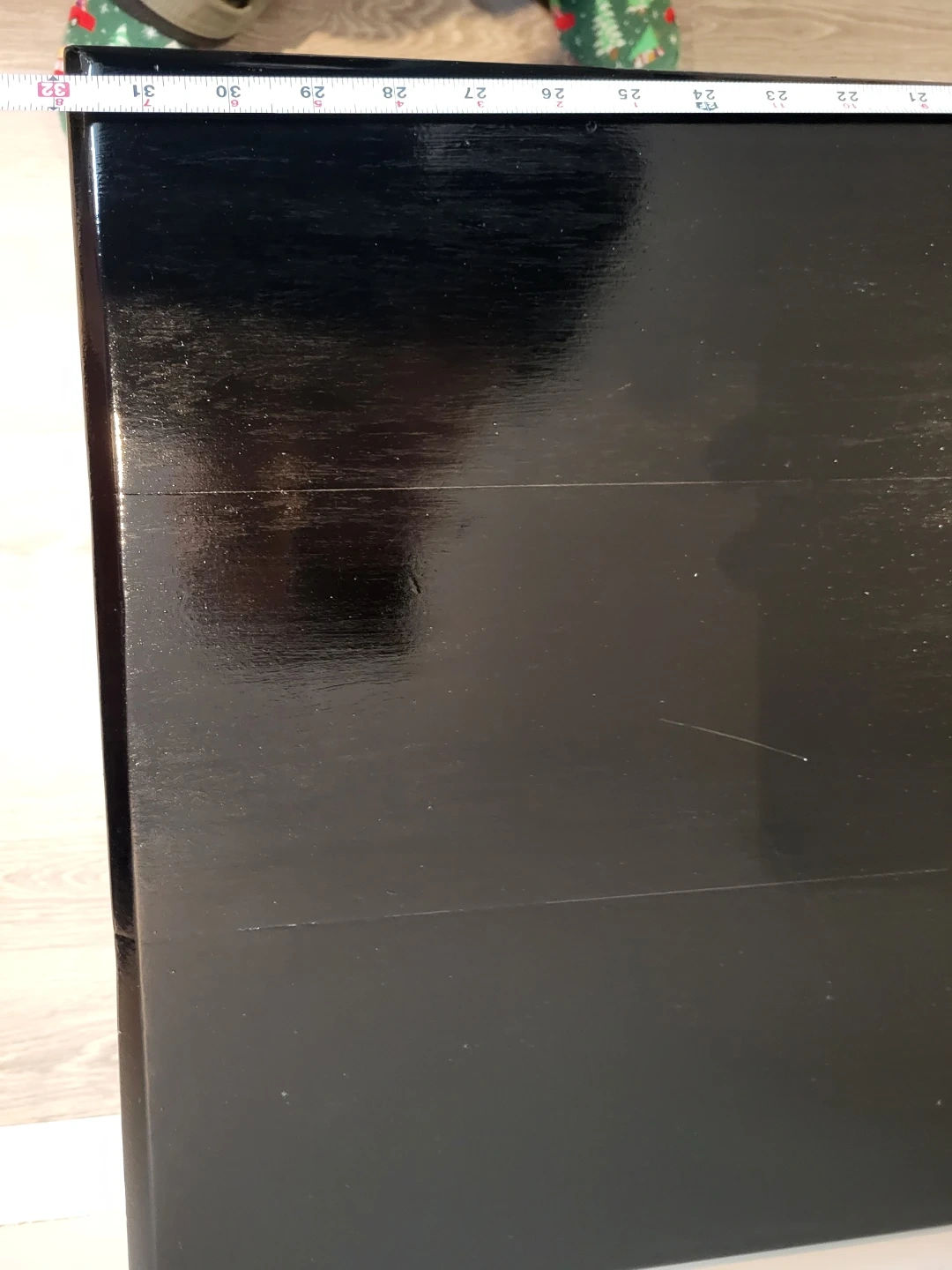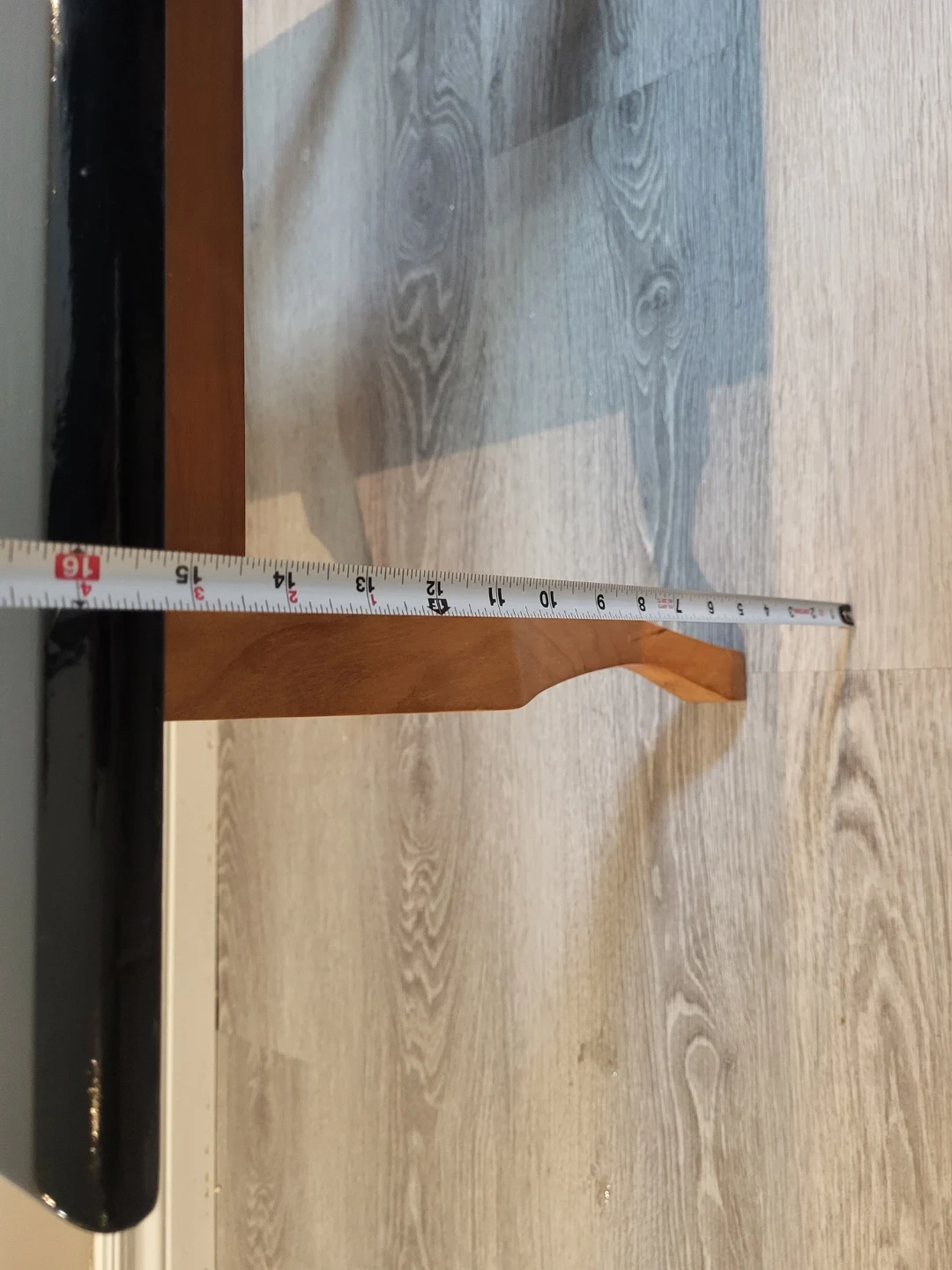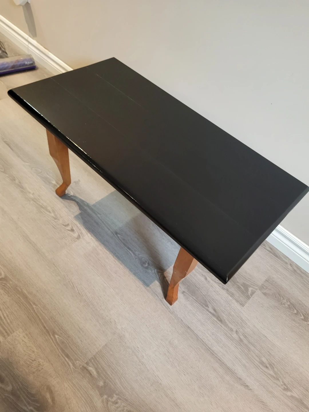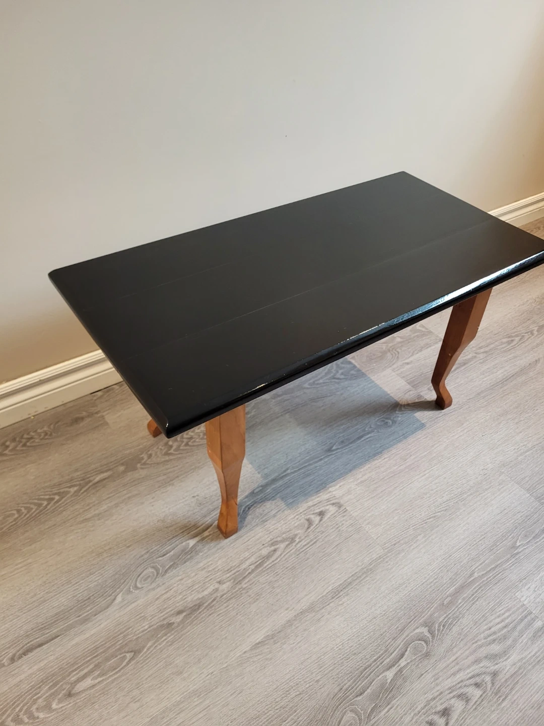 A rectangular coffee table with a glossy black top and natural wood legs. It measures approximately 30 inches long by 15 inches wide. This table's classic design makes it a versatile addition to any living space.