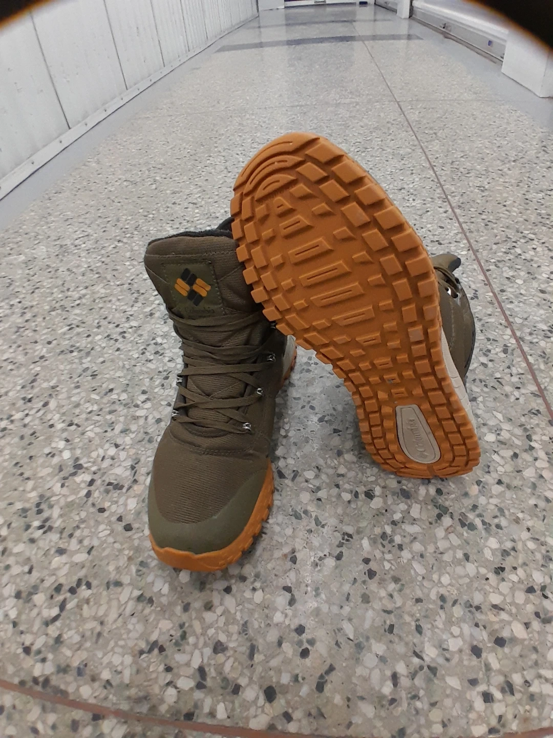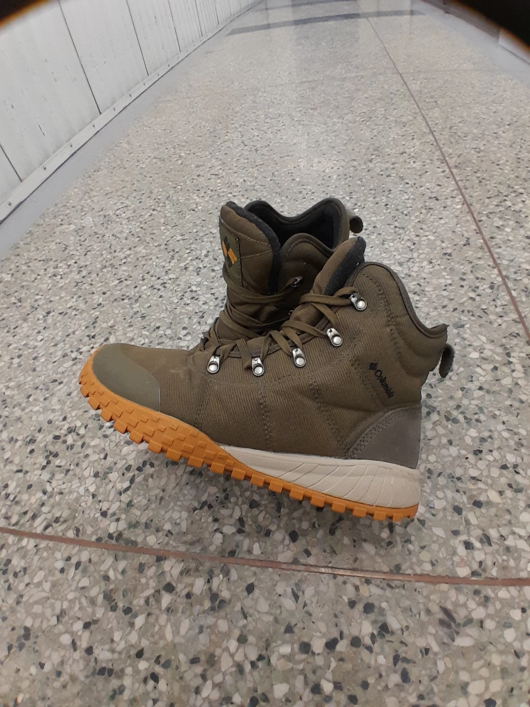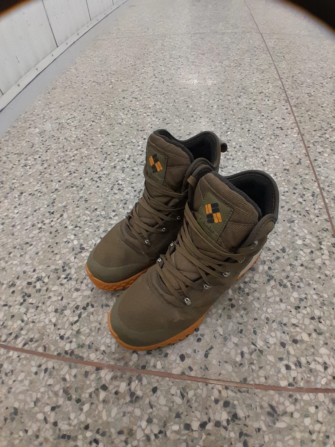 Columbia original winter boots in olive green. Features a durable textile upper and a grippy rubber outsole for traction. Lace-up closure ensures a secure fit. These boots are great for hitting the trails! Men's size 9.5