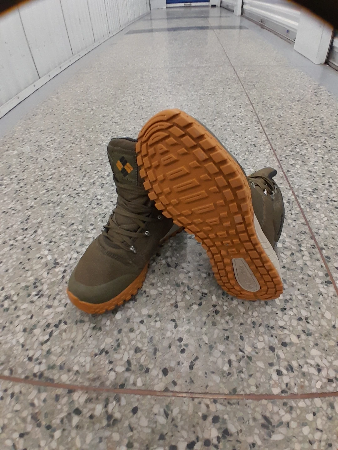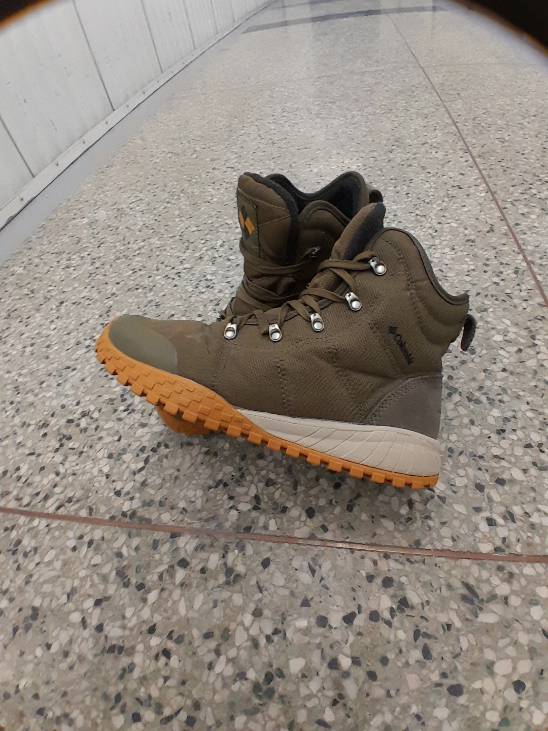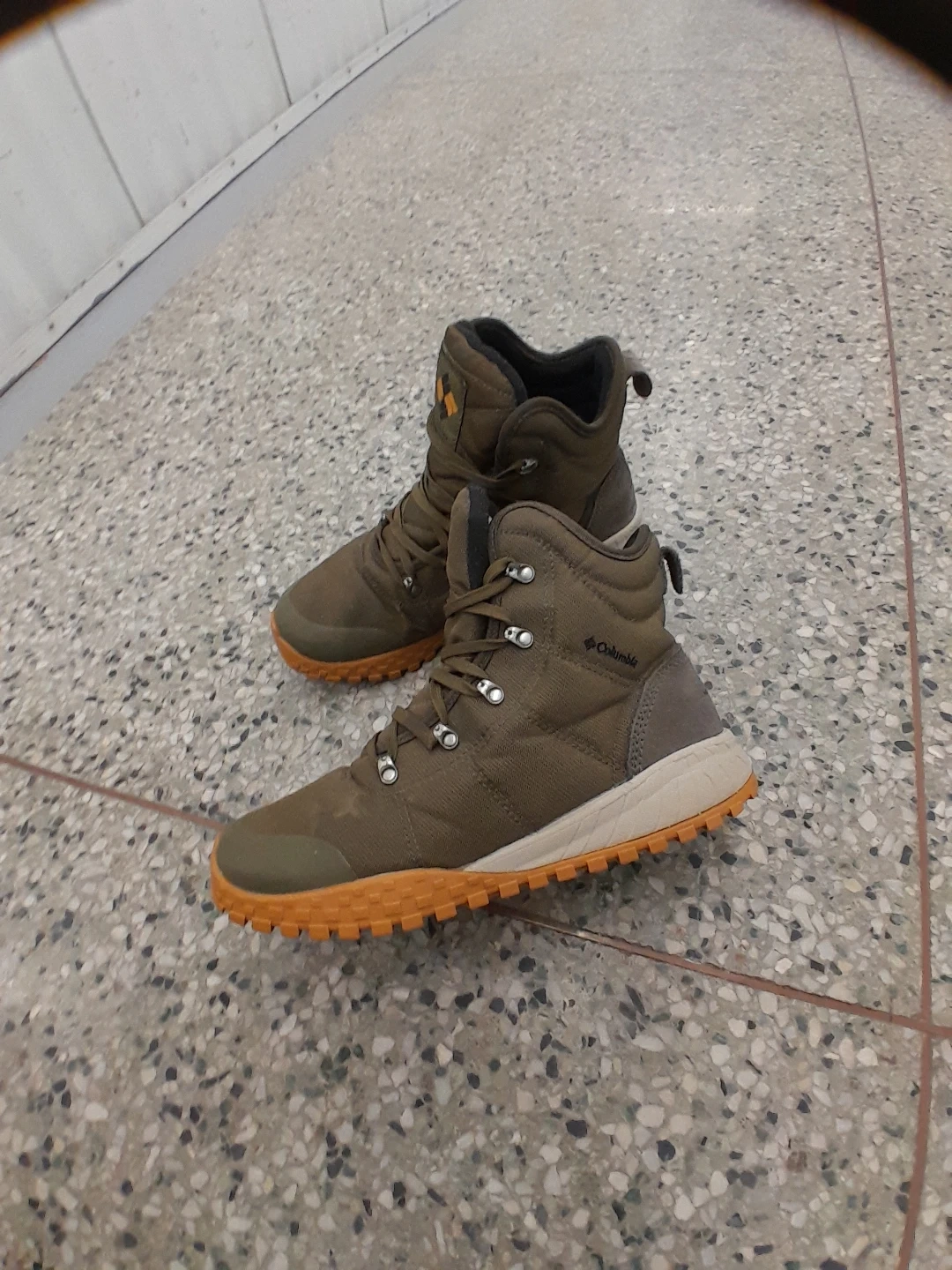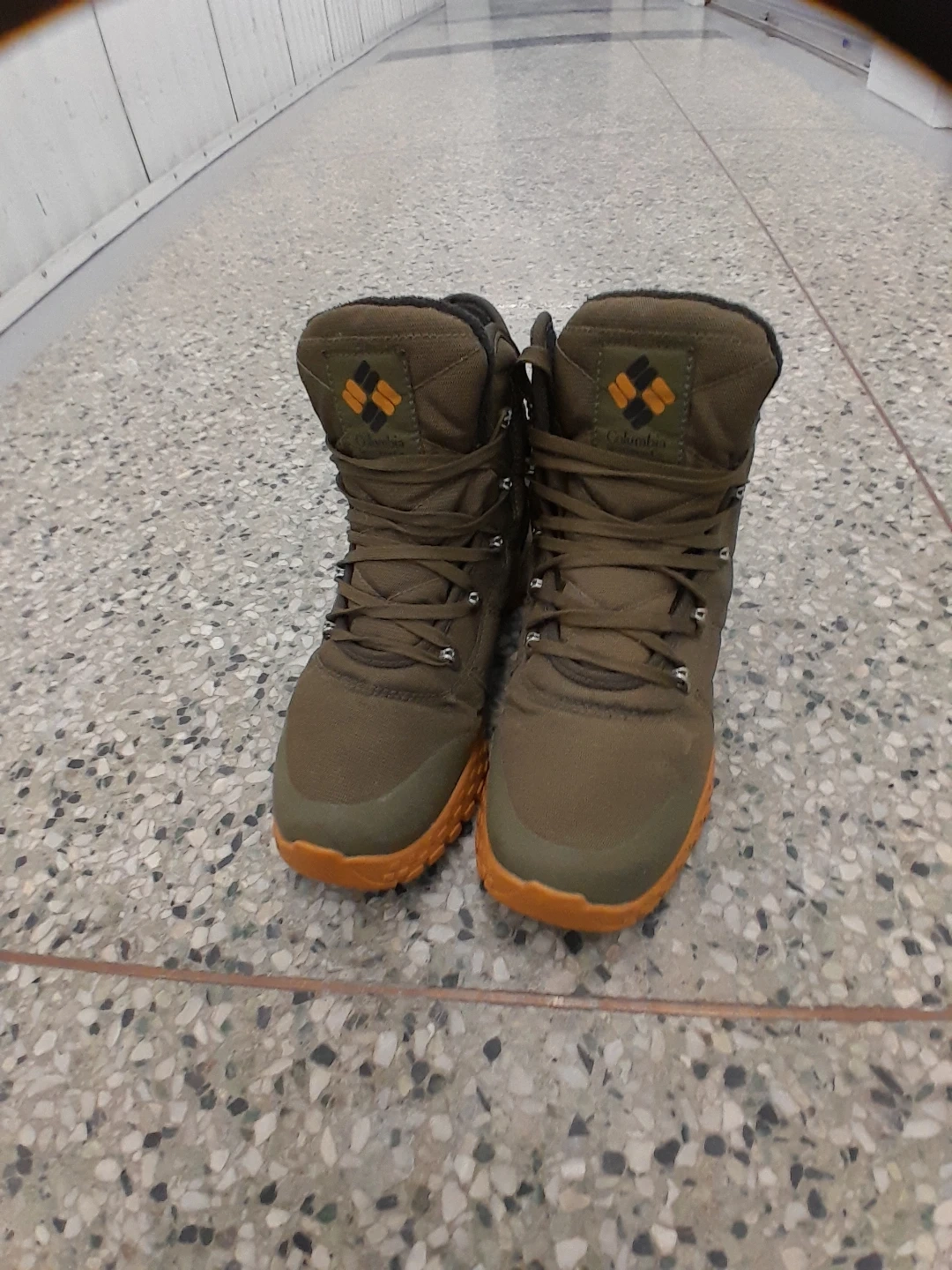 Columbia original winter boots in olive green. Features a durable textile upper and a grippy rubber outsole for traction. Lace-up closure ensures a secure fit. These boots are great for hitting the trails! Men's size 9.5