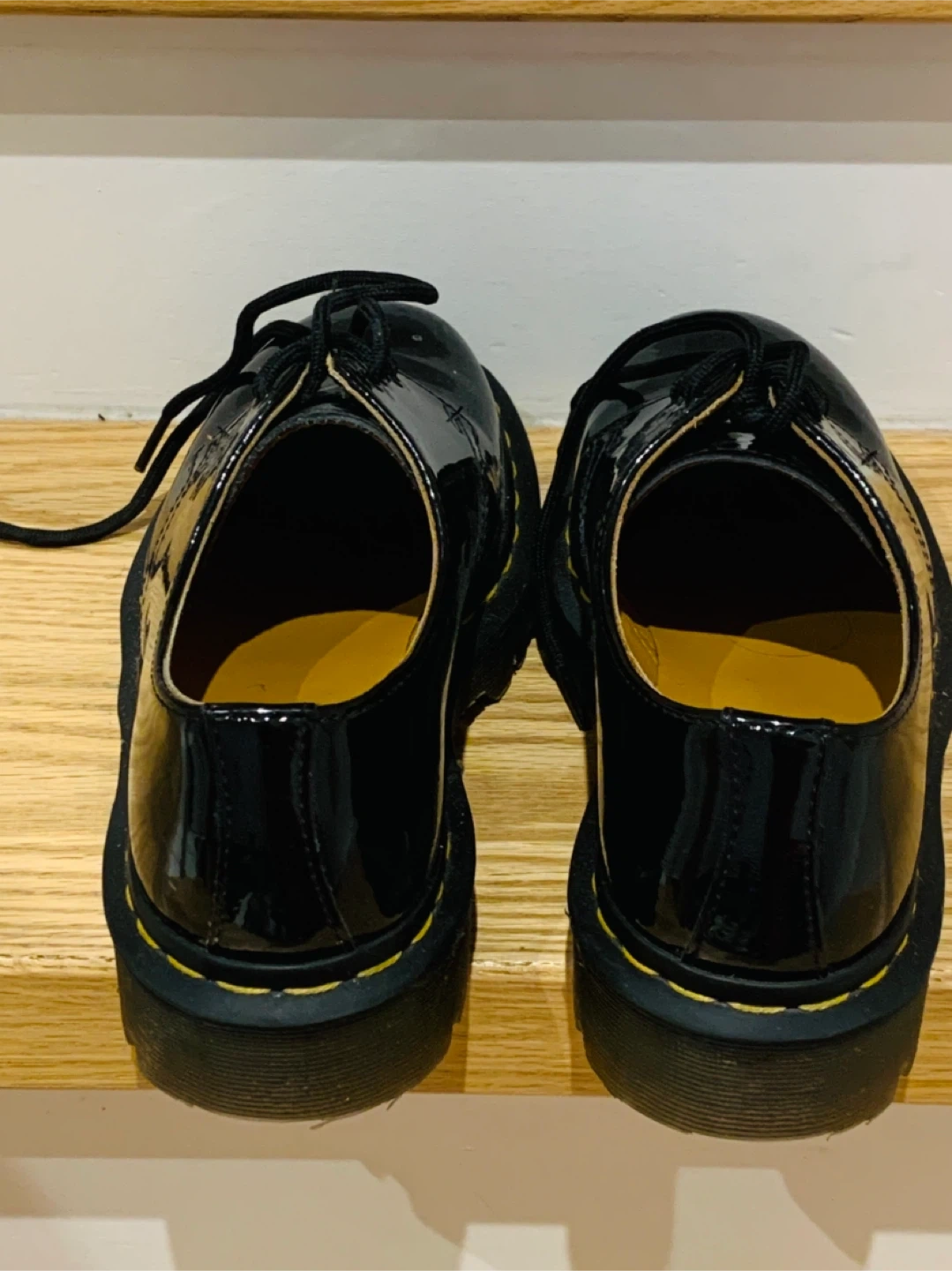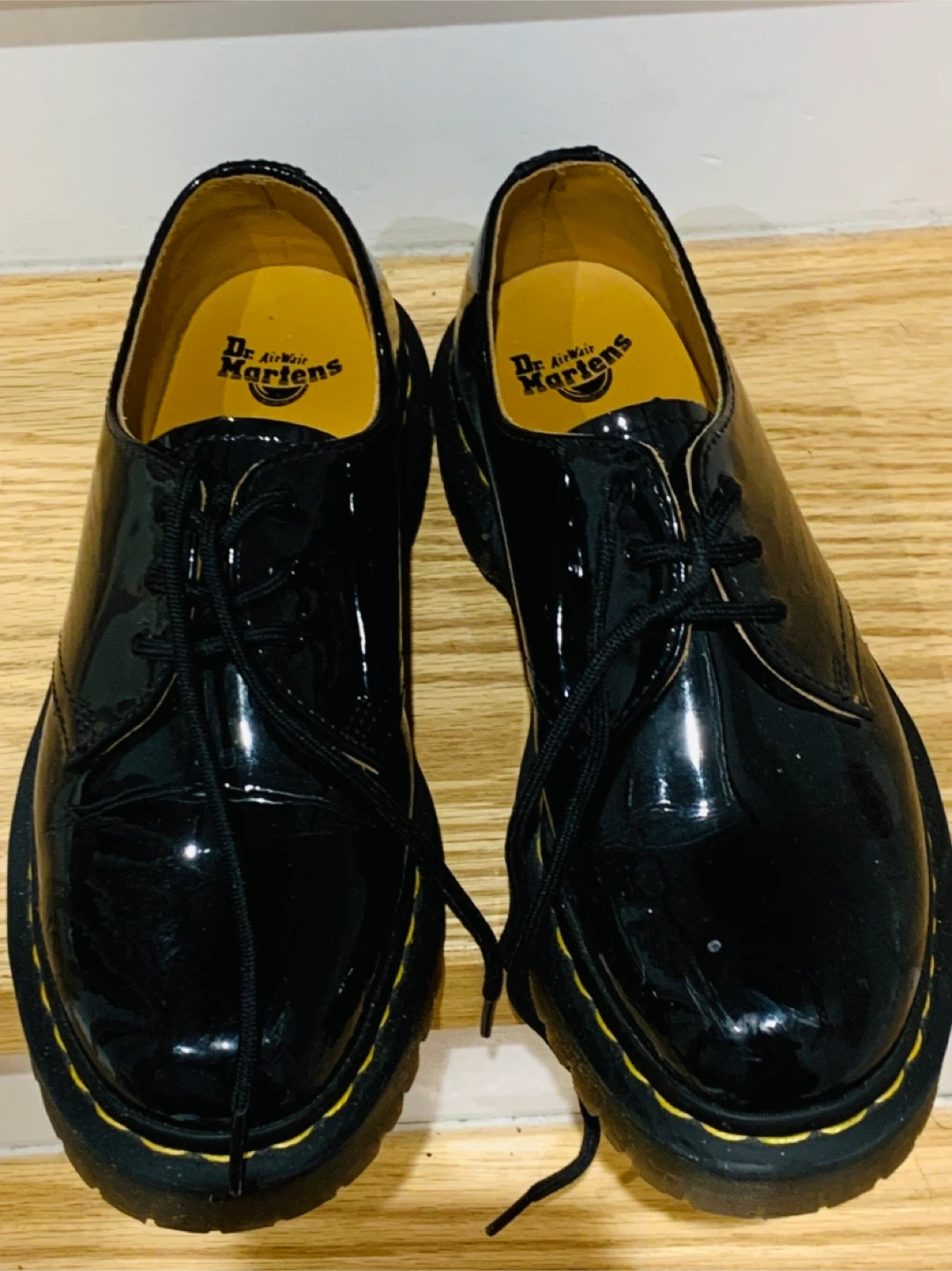 These Dr. Martens shoes are made of black patent leather. They're a Women's size US 8, which is a UK 6. The soles are oil, fat, acid, petrol, and alkali resistant.