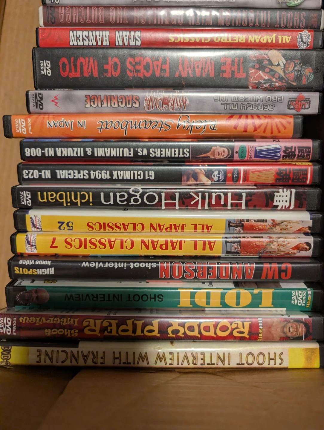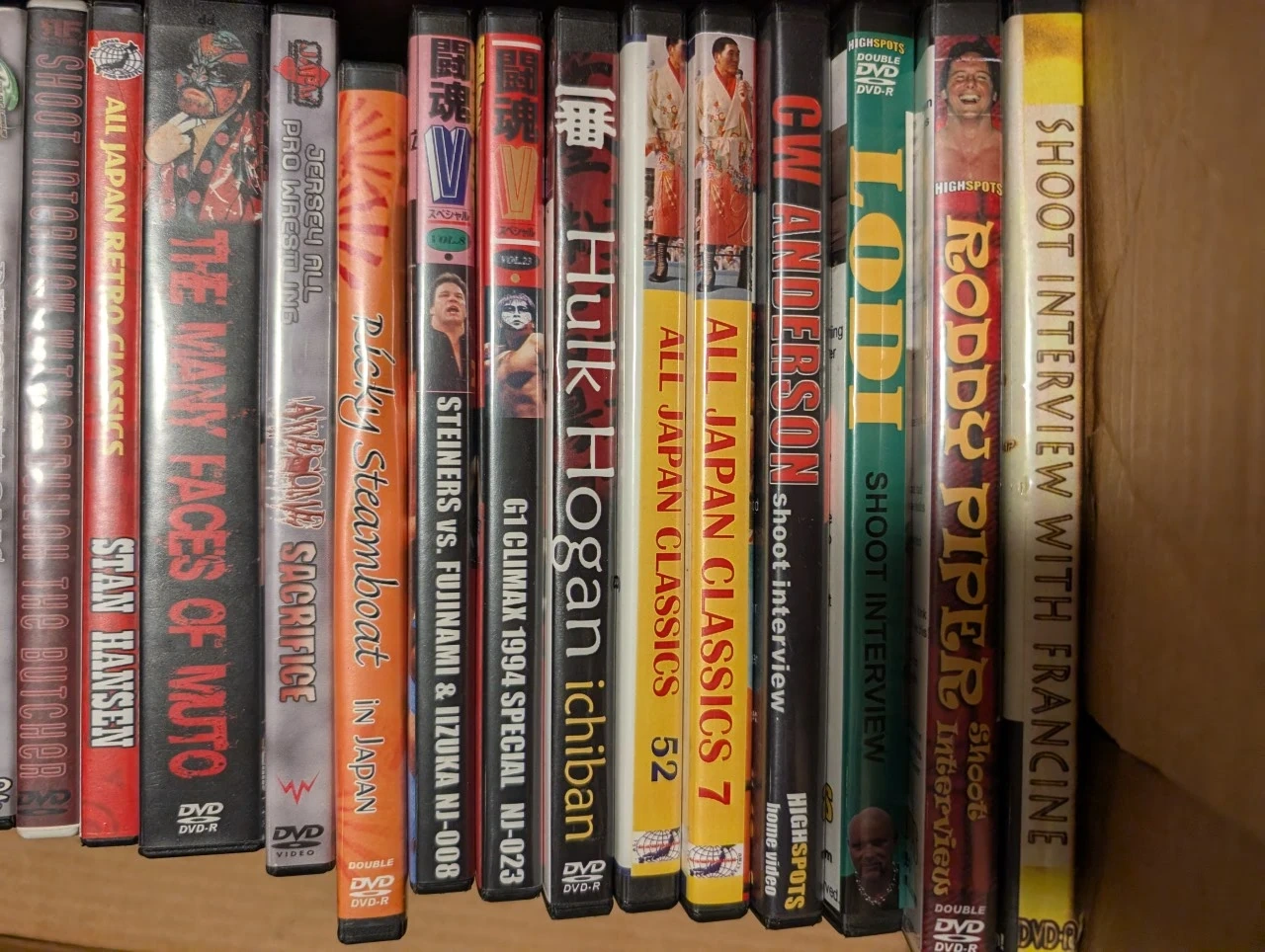 Collection of pro wrestling DVDs featuring various promotions and wrestlers. Includes titles like 'All Japan Classics', 'Hulk Hogan ichiban', and 'Shoot Interview' series. These are DVD format releases.