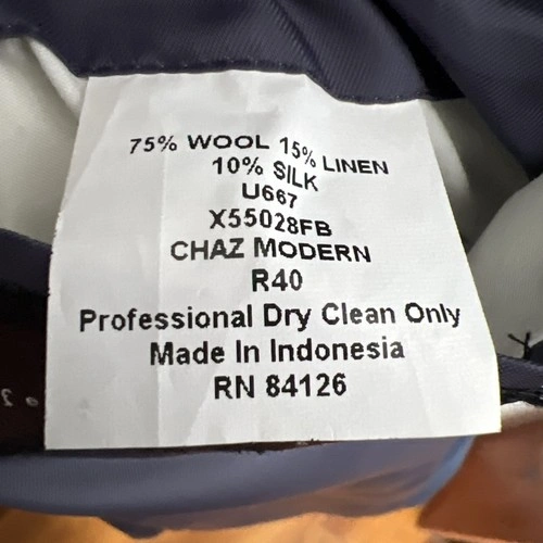 Classic men's blazer by Kroon in a clean blue color. Details: Brand: Kroon, Size: Men’s 40R, Fit/Style: Chaz Modern, Fabric: 75% Wool / 15% Linen / 10% Silk, Care: Professional dry clean only, Made in Indonesia. Condition: Pre-owned, good condition (see photos).