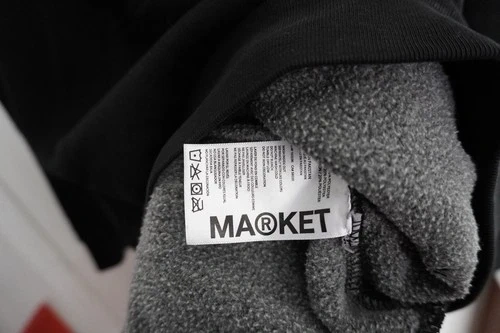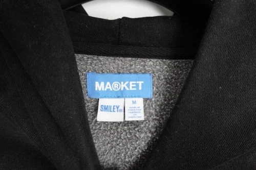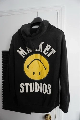 Authentic Market Studios Smiley Face pullover hoodie in black. Features the iconic yellow Smiley logo with “Market Studios” text on the front and a large Smiley graphic on the back. Soft fleece interior for warmth and comfort. Classic kangaroo pocket and adjustable hood. Details: Brand: Market Studios (MARKET®), Collaboration: Smiley, Style: Pullover hoodie, Color: Black, Material: Cotton / Polyester blend (per tag), Pocket: Front kangaroo pocket, Hood: Adjustable drawstrings, Graphics: Front & back printed Smiley design.