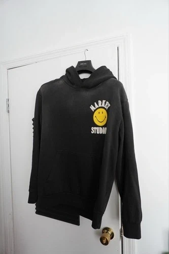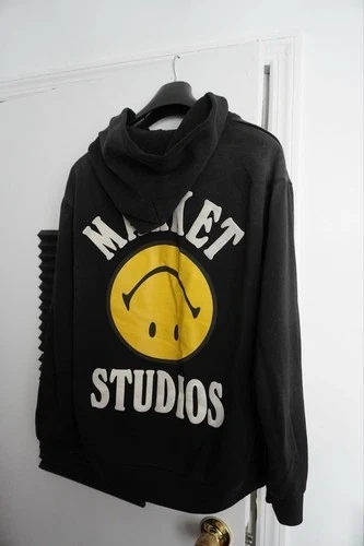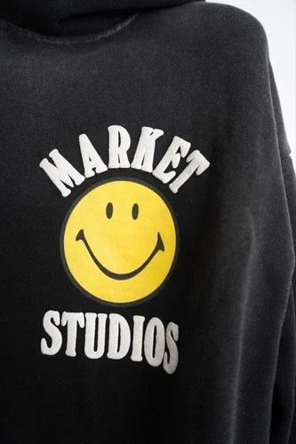 Authentic Market Studios Smiley Face pullover hoodie in black. Features the iconic yellow Smiley logo with “Market Studios” text on the front and a large Smiley graphic on the back. Soft fleece interior for warmth and comfort. Classic kangaroo pocket and adjustable hood. Details: Brand: Market Studios (MARKET®), Collaboration: Smiley, Style: Pullover hoodie, Color: Black, Material: Cotton / Polyester blend (per tag), Pocket: Front kangaroo pocket, Hood: Adjustable drawstrings, Graphics: Front & back printed Smiley design.