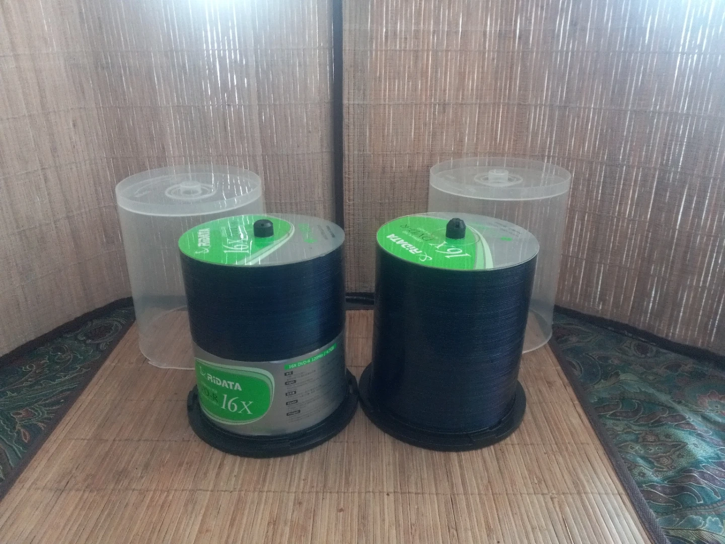 Two spindles of 100 pcs each.. Ridata 16x DVD-R discs. Each disc holds 120 minutes or 4.7GB of data. They come in their original plastic cases.