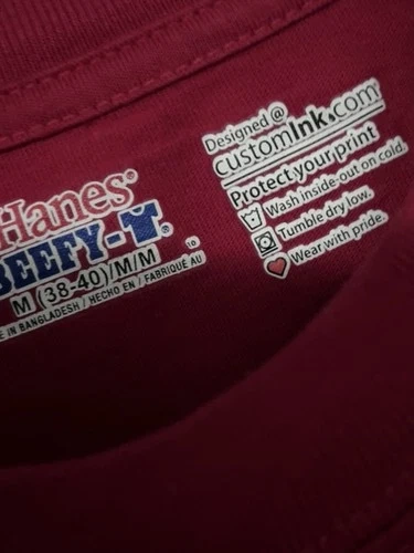 Custom men's T-shirt in size M. Features a regular fit, crew neck, and short sleeves. Made from cotton, the shirt is a solid red color. Perfect for casual wear, this T-shirt is comfortable and has a classic style suitable for everyday wear.