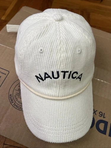 This is a white cotton baseball cap from Nautica, perfect for casual wear in summer, fall, and spring. It has an adjustable strap for a comfortable fit and an outdoor theme. It's a versatile accessory that can elevate any casual outfit with its classic style and iconic branding.
