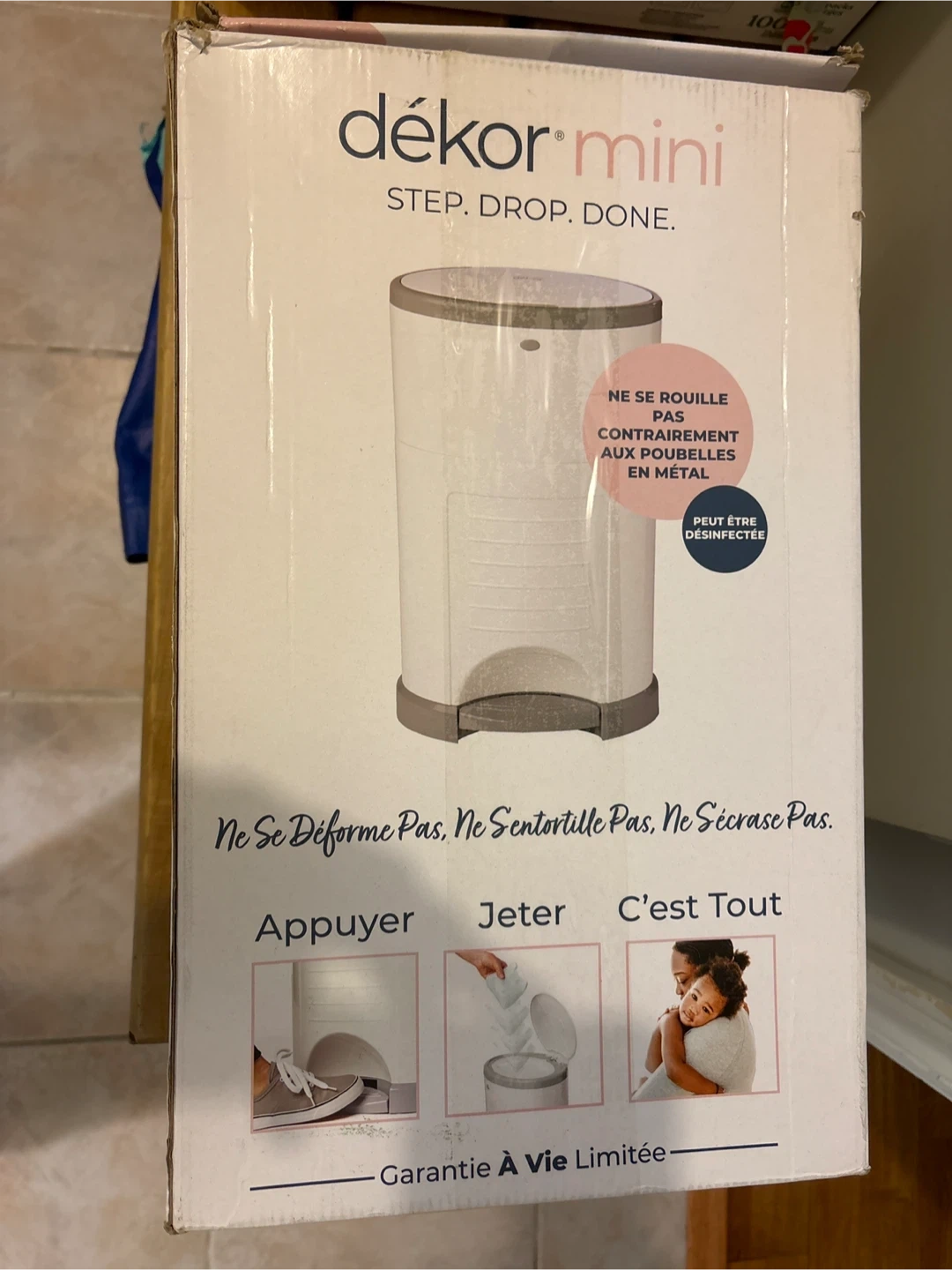 This is a Dékor Mini diaper pail. It's made of durable plastic and won't rust like metal bins. It's designed for easy use with a step, drop, and done operation.