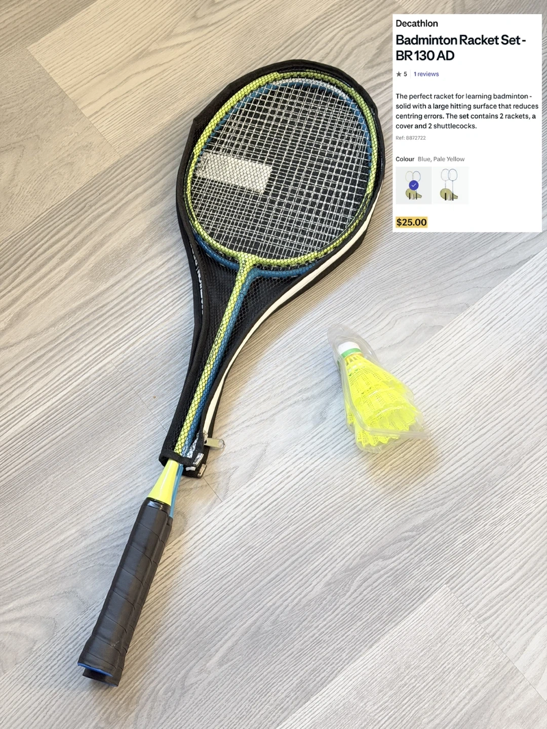 This set includes 2 rackets and 2 shuttlecocks, along with a cover. It's perfect for learning badminton with its large hitting surface that helps reduce centering errors. The colour is Blue, Pale Yellow.
