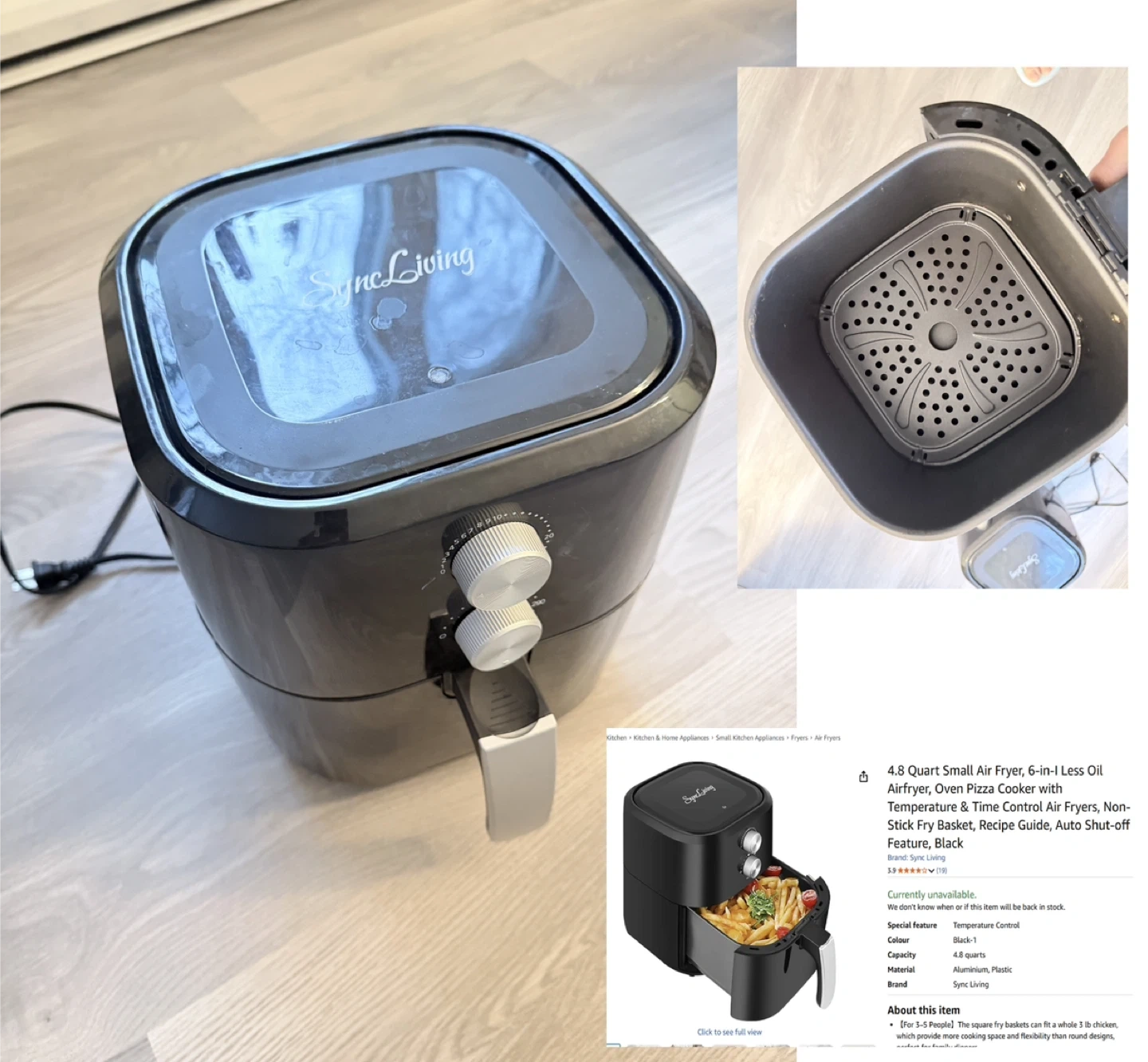 This Sync Living air fryer has a 4.8-quart capacity and temperature control. It comes with a non-stick fry basket. This appliance is great for cooking a variety of foods quickly!