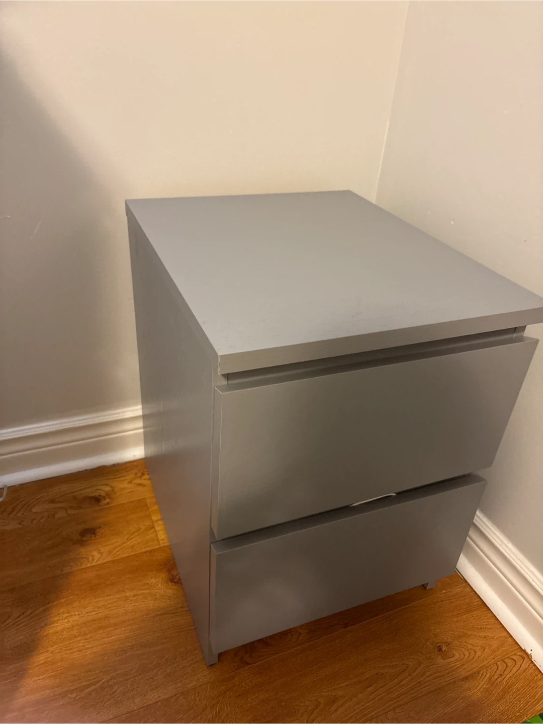 This is a simple grey nightstand with two drawers. It's a practical piece for bedroom storage. Made of particleboard/MDF. Measures approximately 20" H x 18" W x 15" D.