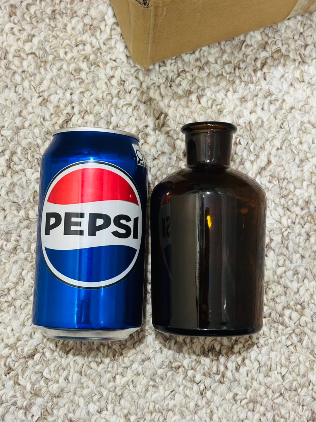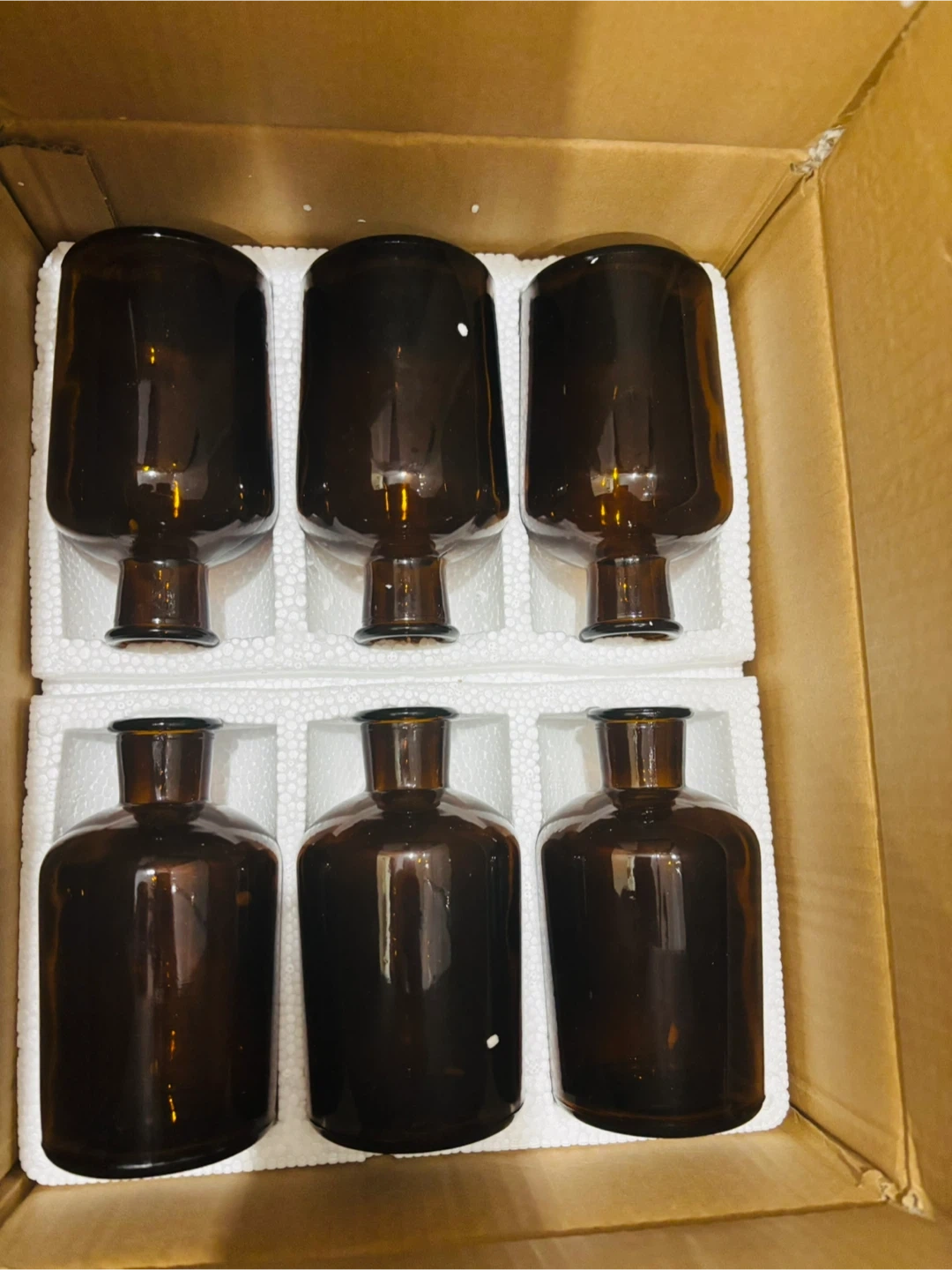 A set of six amber glass bottles, perfect for small vases or decorative storage. The bottles have a neck opening and a capacity for small items. They're packaged in a cardboard box with protective foam inserts.