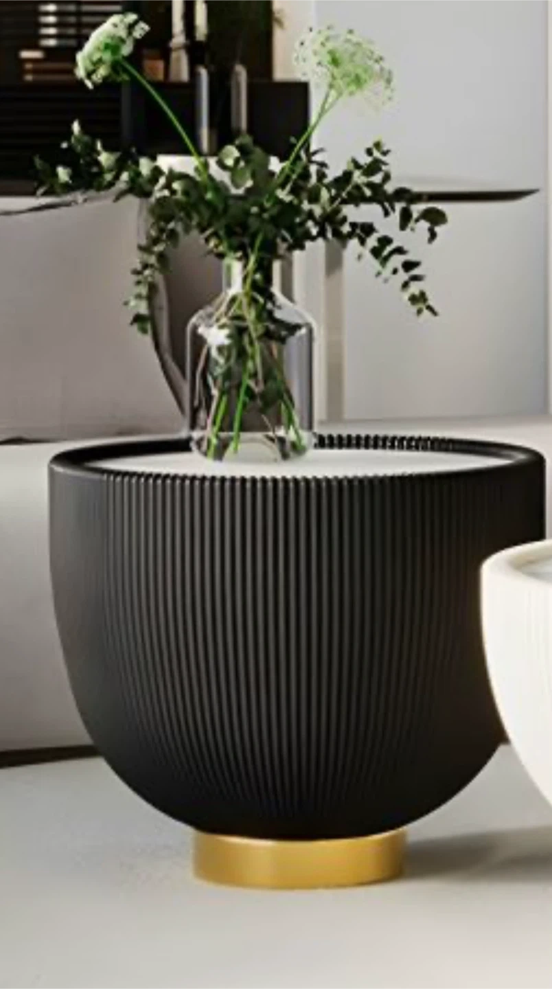 A stylish fluted round side table with a modern ribbed design. It features a black exterior with a contrasting gold-tone base. Dimensions: 500mm/19.7" width, 450mm/17.7" height, and a base height of 60mm/2.4".