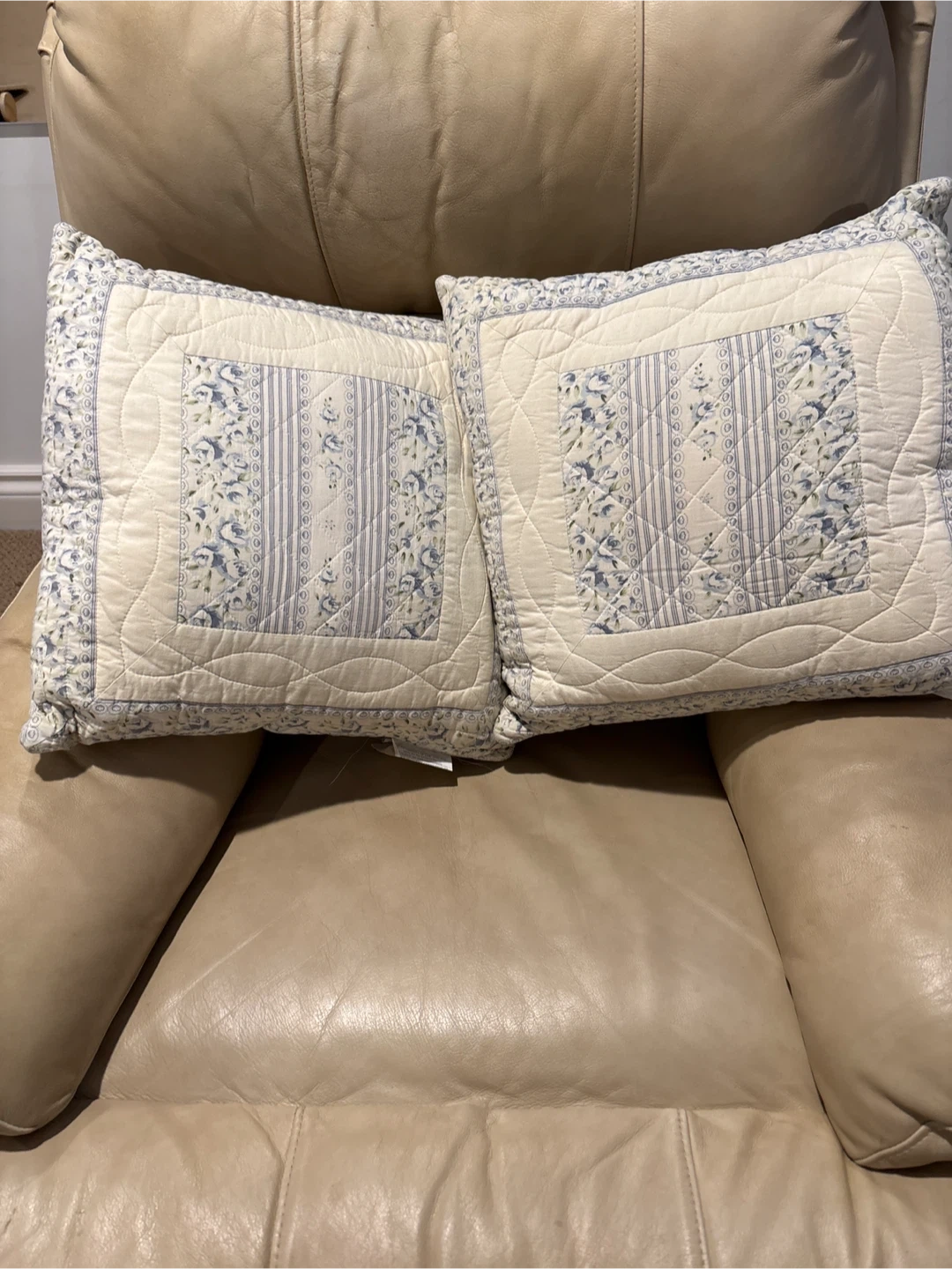 These are two decorative throw pillows. They have a quilted design with blue floral and striped patterns. They're made of fabric and would add a charming touch to any seating area. No holes, stains or tears.