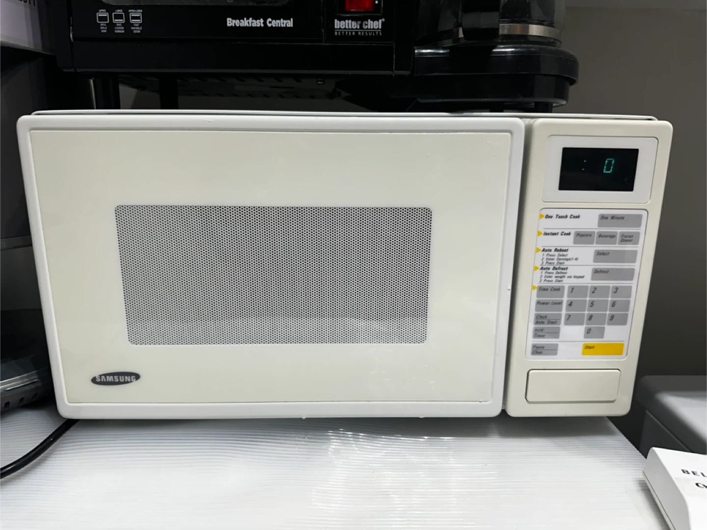 White Samsung microwave oven. It features several one-touch cook options and auto-defrost settings. Perfect for quick meals and reheating. Measures 17.5" W x 10" H x 14" D.