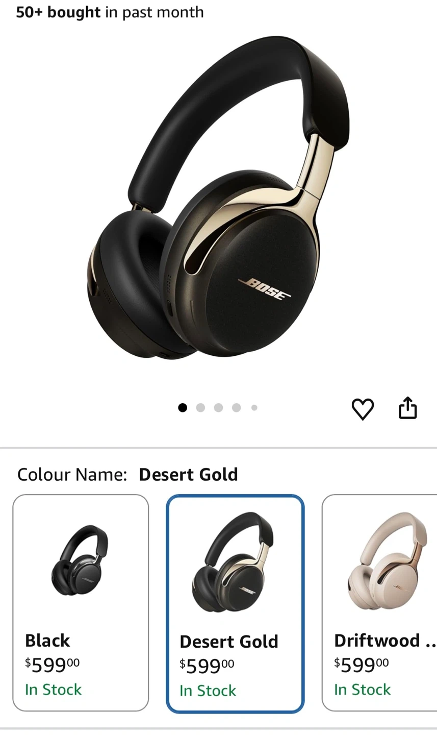 These Bose QuietComfort Ultra headphones offer noise cancelling. They're the 2nd generation model in Desert Gold. Includes original box and charging cable.