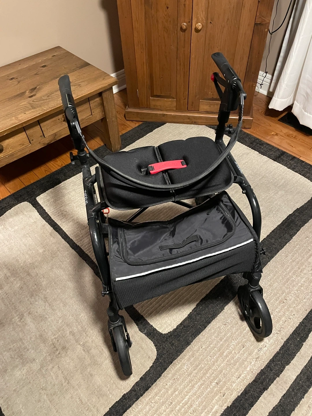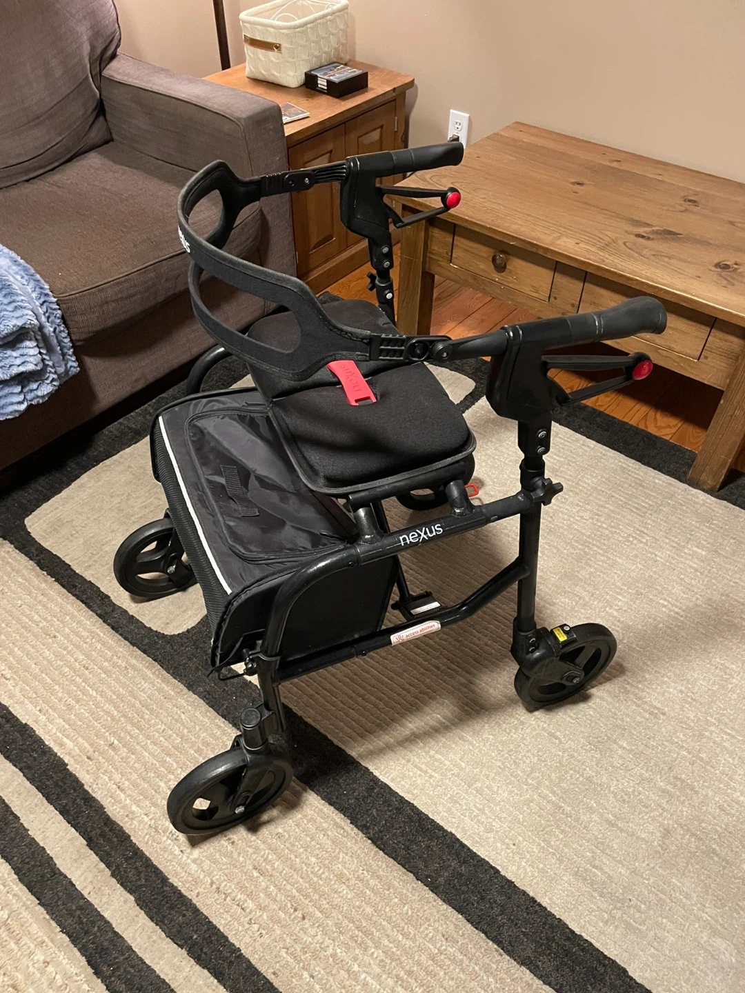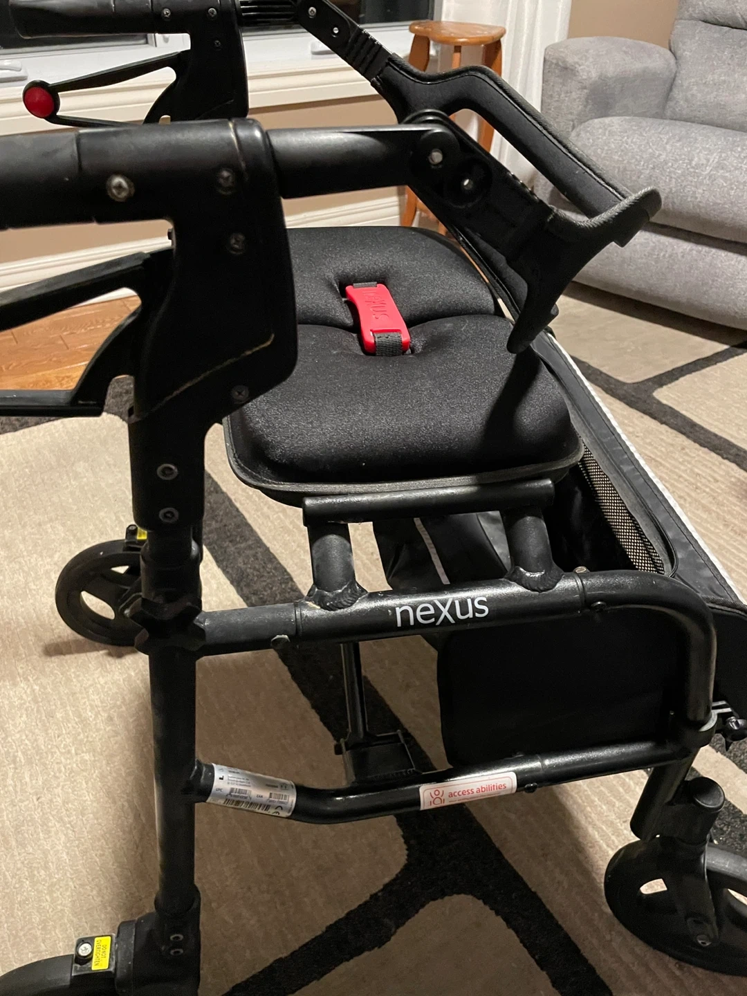 This Nexus rollator walker features a comfortable seat and a handy storage bag. It has a weight capacity of 150kg (330.7lb) and measures 59.5cm (23.5") wide and 62cm (24.4") deep. This walker is designed for stability and ease of use. It was manufactured in January 2020.