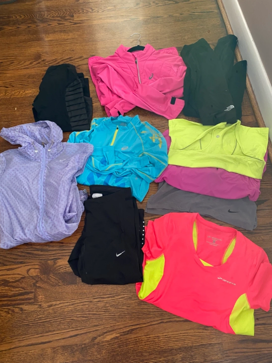 This bundle is good for a runner, cyclist or avid gym goer. It includes a variety of athletic tops, jackets, and bottoms from brands like Nike, lululemon, the north face. ASICS, Brooks and more. There are 10 pcs in total. The items are suitable for running and workouts indoors or outdoors. Most items are a size small a couple are a size med but fit me more like a small. Please refer to the pictures for more details as style and conditions.