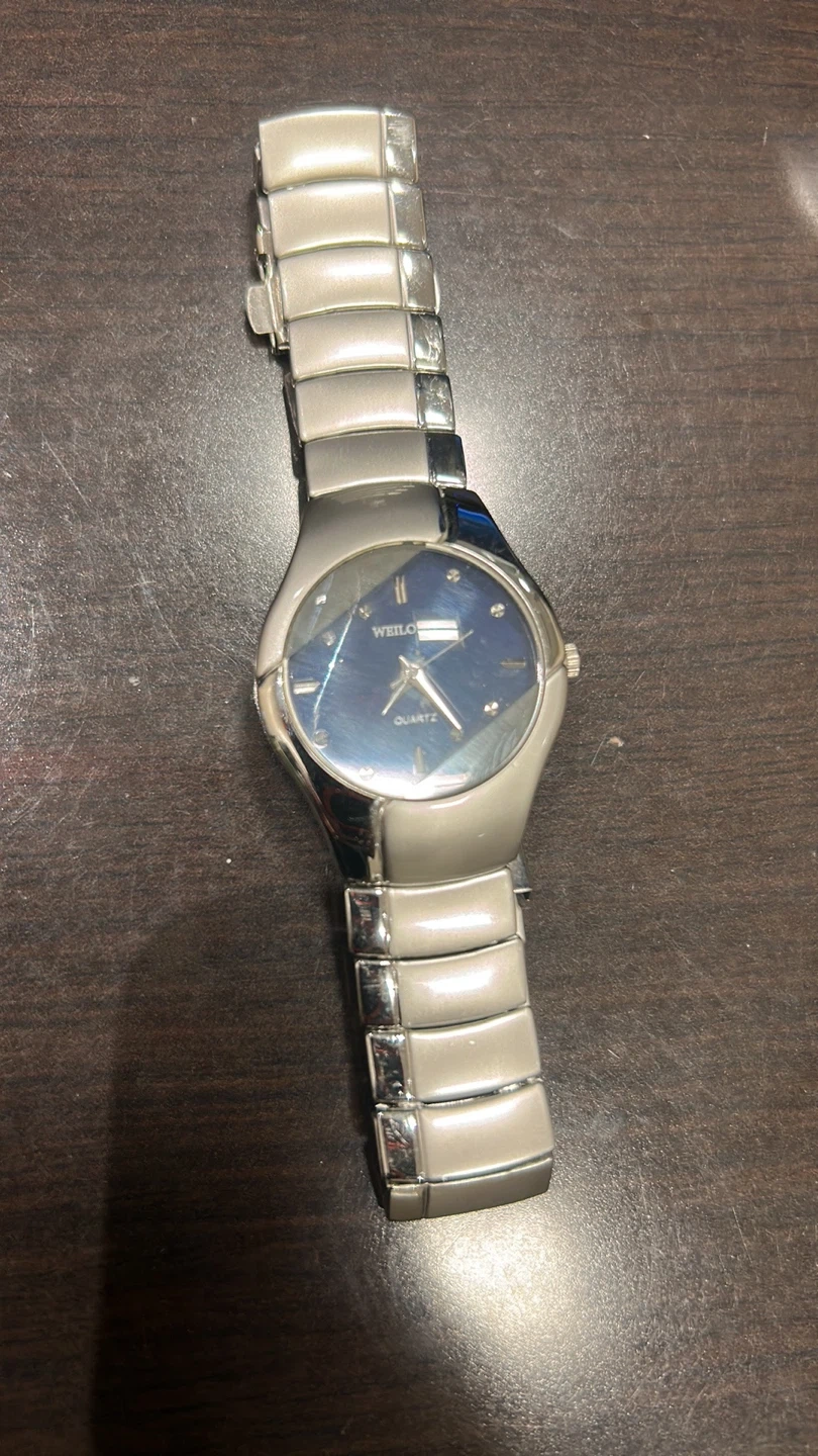 WEILO quartz watch with a blue face and silver-tone metal band. It's a stylish timepiece. The band is made of metal. This watch is great for everyday wear.