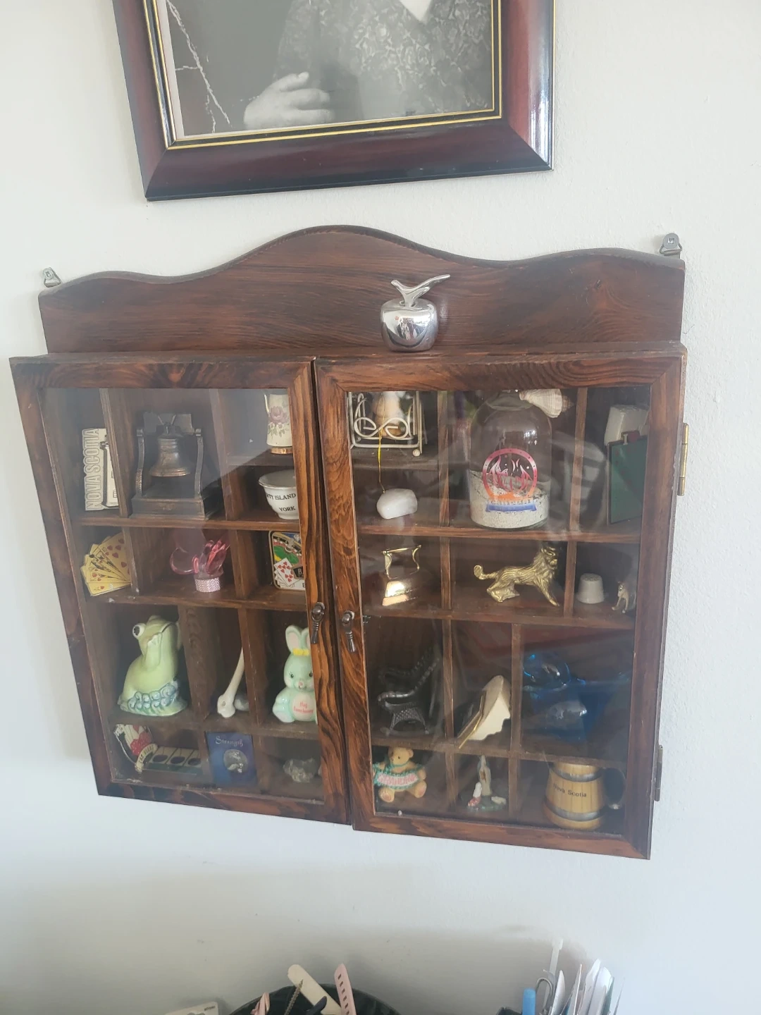 A charming wooden display cabinet featuring two glass doors and multiple compartments, perfect for showcasing small collectibles. The cabinet has a vintage look and would be great for storing trinkets or displaying miniatures. It's made of wood comes with a few trinkets that are from 50s 60 70s