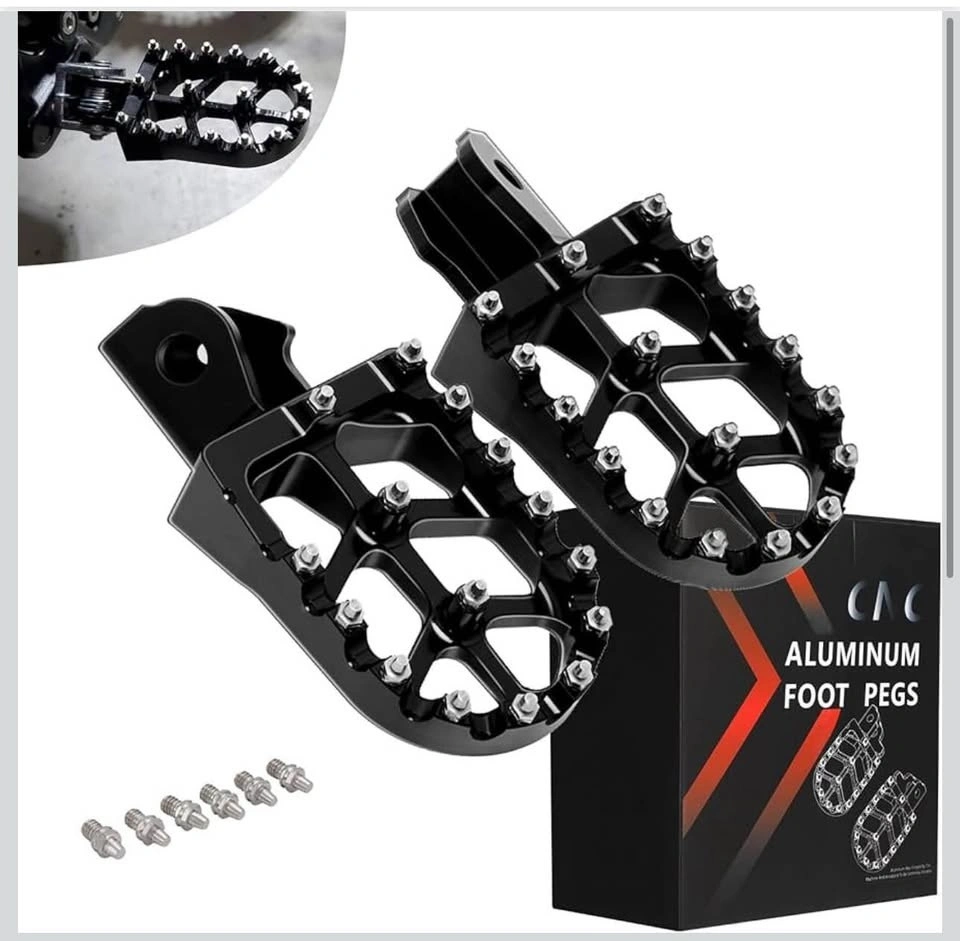 Brand new JFG RACING CNC machined foot pegs made from strong 7075 aluminum. These black pegs offer excellent grip with stainless steel screw-teeth for anti-slip control. They feature an extra-wide platform for better bike control. Designed for Sur Ron, CRF150F (2003-2017), and CRF230F (2003-2019). Please note, these do not come with springs. The left and right pegs have a different number of pins (15 vs 16) for easy identification, which doesn't affect their function. Pickup is available in Burlington only. Cash payment is required at pickup; no e-transfers. This is a final sale, so please inspect the item carefully during pickup as returns are not accepted.