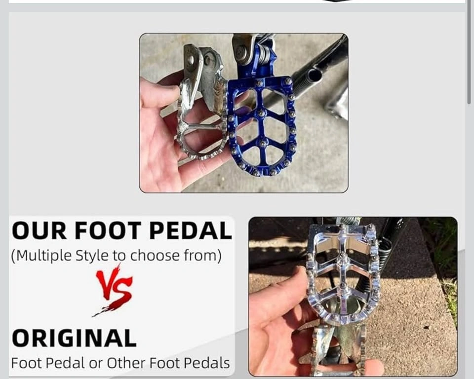 Brand new JFG RACING CNC machined foot pegs made from strong 7075 aluminum. These black pegs offer excellent grip with stainless steel screw-teeth for anti-slip control. They feature an extra-wide platform for better bike control. Designed for Sur Ron, CRF150F (2003-2017), and CRF230F (2003-2019). Please note, these do not come with springs. The left and right pegs have a different number of pins (15 vs 16) for easy identification, which doesn't affect their function. Pickup is available in Burlington only. Cash payment is required at pickup; no e-transfers. This is a final sale, so please inspect the item carefully during pickup as returns are not accepted.